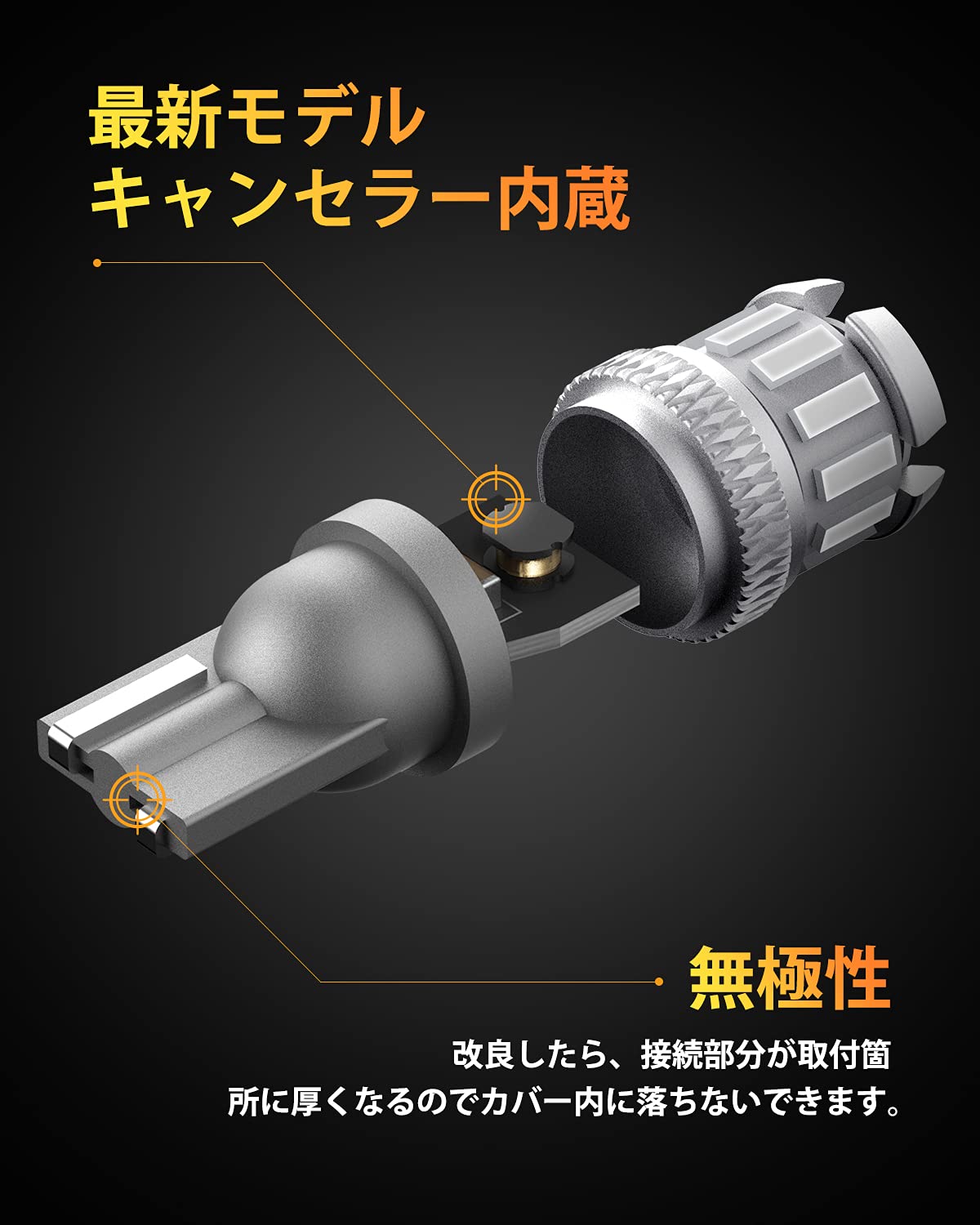 【改良ソケット&キャンセラー内蔵 】T10のソケットは改良したら、接続部分が取付箇所に厚くなるのでカバー内に落ちないできます。ルーズや接触不良心配しないでください。取付簡単、キャンセラー内蔵で大部分車種はエラーフリー、DC12V車用T10 ledバルブ2個セット。