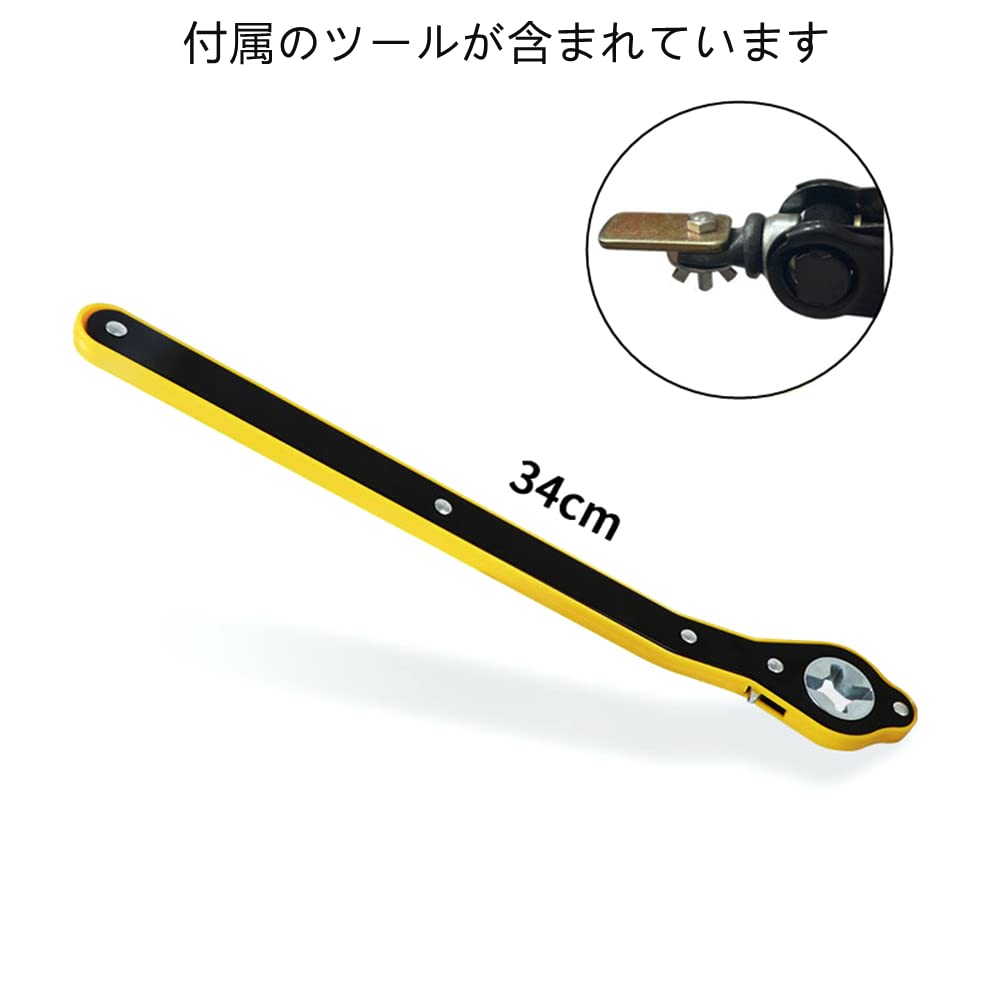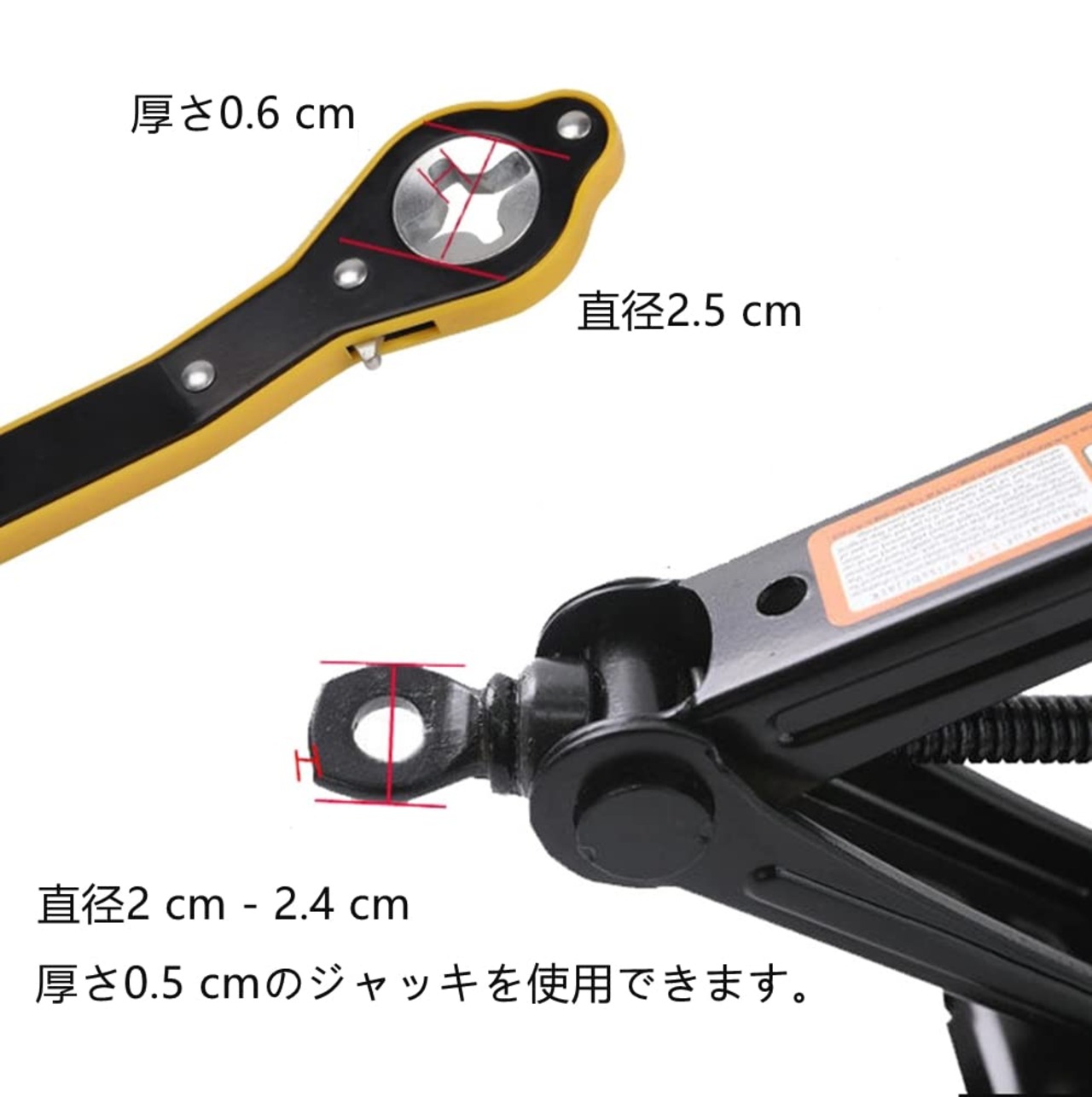 【人間工学に基づいた設計】ラチェットレンチ構造、360°回転ヘッドラチェットレンチジャックレイバーレンチを使用してジャッキを補助します。旅行中の緊急または交換用タイヤでは、車両を簡単に持ち上げることができます。付属のアジャスター使用込みで、ほとんどのジャッキで使用可能。汎用性が高く、写真のように大部分の純正ジャッキに使用可能サイズ:長さ約34cm。材質:鉄板+プラスチック+炭素鋼。