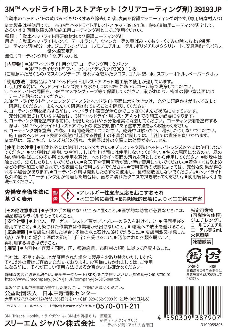 3M 39193JP ヘッドライト クリア コーティング 日本正規品 黄ばみ クリーナー