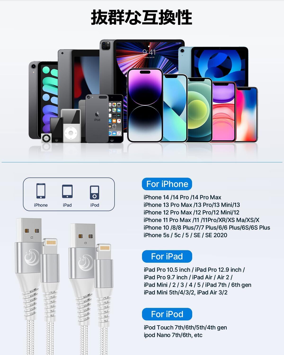 【対応可能のiOS機種】このアイフォン充電ケーブルは、最新のiPhone 14、14 Pro、14 Pro Max、14 plusに対応できるだけでなく、iPhone 13/13 Pro/13 Pro Max/13 mini、iPhone 12/12 Pro/12 Pro Max/12 mini/SE 2020、iPhone 11/11 Pro/11 Pro Max/XS/XR/XS Maxにも対応できるし、iPhone 8/8 plus/7/7 plus/6/6s/6 plus/5/SEにも対応できます。