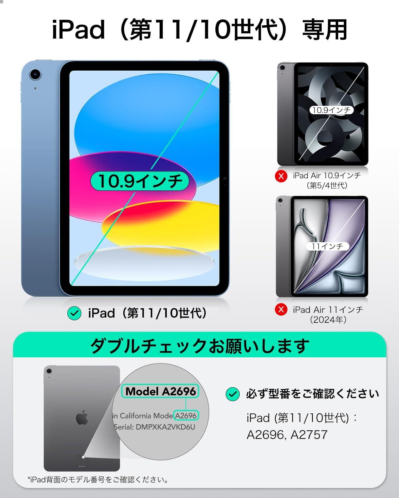 【互換性】:iPad 第11世代 (11インチ、2025モデル)、iPad 第10世代 (10.9インチ、2022モデル) に対応。モデル番号A2757、A2696、A2777。他のiPadモデルには非対応です。互換性を確認するには、iPadの背面下部にあるモデル番号「AXXXX」を確認してください