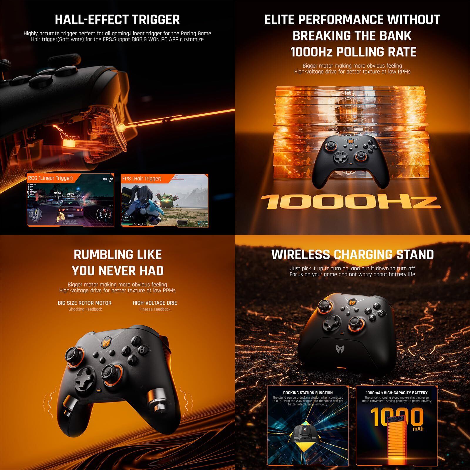 【多機能ゲーミングコントローラー】Switch、PC Windows10&11、Android、iOS用Gale HallワイヤレスPCコントローラーは、4つのカスタムバックボタン、ホールジョイスティック、ホールトリガー、6軸ジャイロモーションコントロール、1000Hz有線ポーリングレート、ターボ、マルコ、 255レベル調整可能な振動、Hブリッジチップ、アンチデッドゾーンアルゴリズム、キーボードマッピング、スクリーンショット、1000mAhバッテリー、スマート充電スタンド、PCアプリ。 BlGBlG WON は、Gale Hall switch コントローラーのより包括的な進化に焦点を当てています。