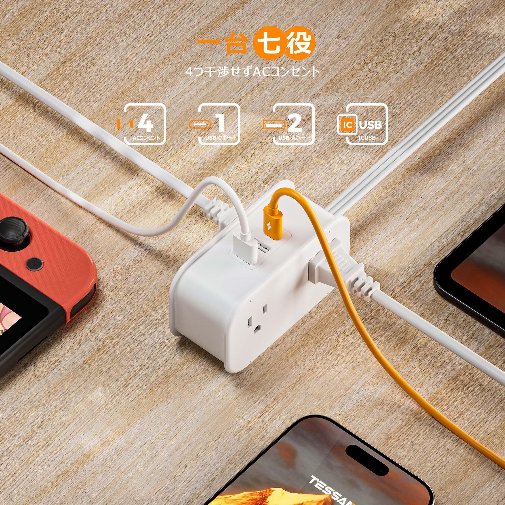 延長コード 2m 電源タップ USB付き たこあしコンセント 薄型プラグ TESSAN 4個口 1個タイプC と2個タイプA コンセントタップ 薄型 タコ足配線 テーブルタップ マルチタップ 分岐 出張 旅行 2ピン/3ピン適用 ホワイト
