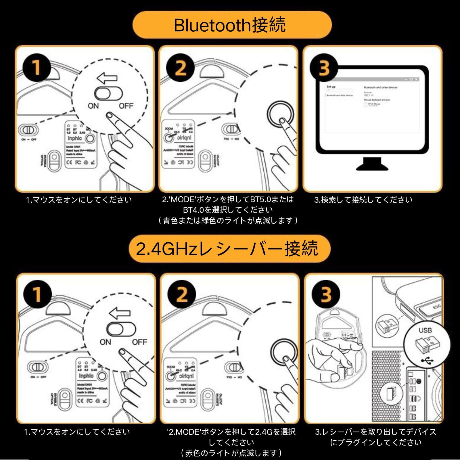 便利な接続:このワイヤレスマウスは、Bluetooth モード(BT4.0 と BT5.0)と 2.4GHz 接続モードを備えています。Bluetooth 対応機器と USB ポートを備えた機器と互換性があり、さまざまな使用シナリオの要件を満たしています。