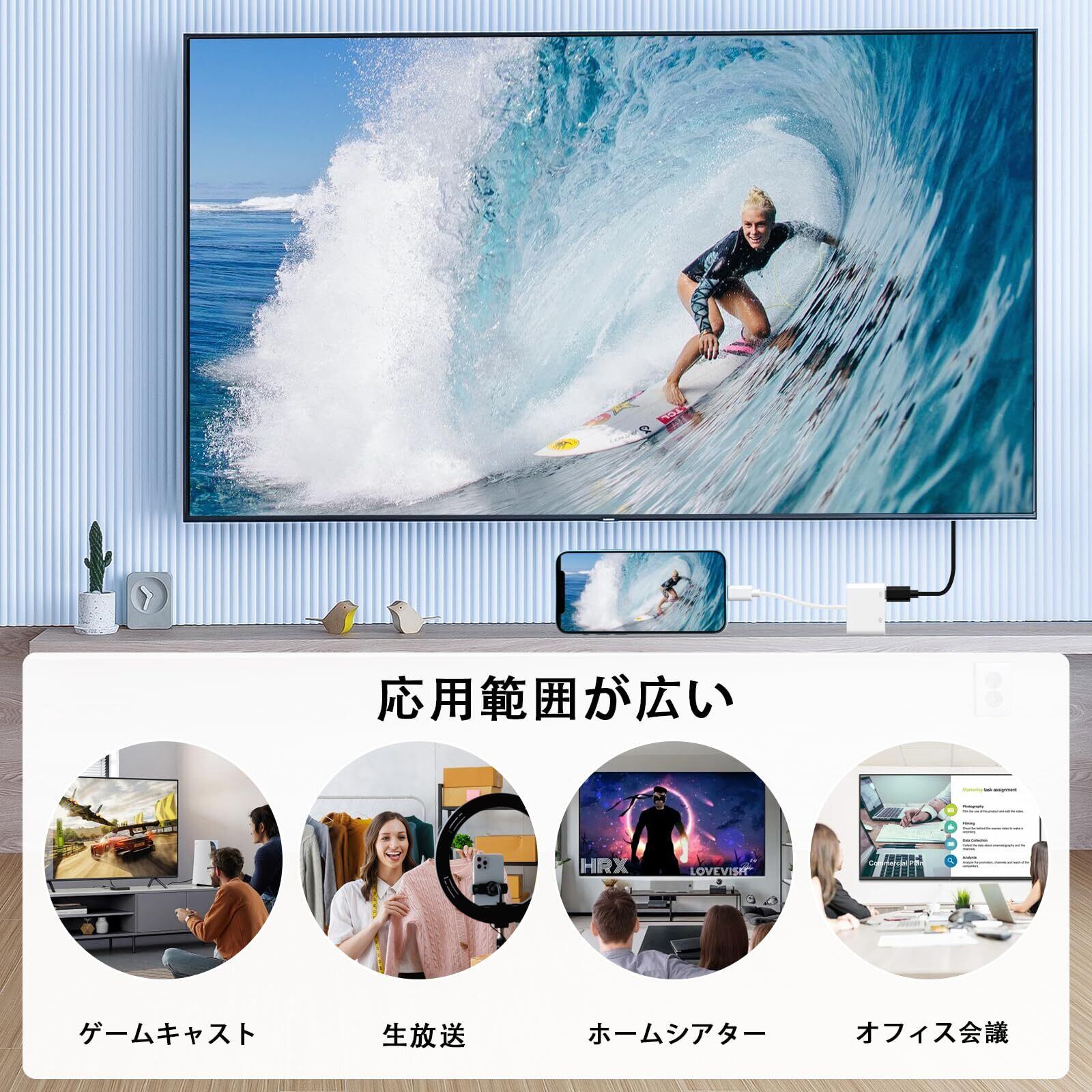 【広範な互換性・iPhone 15/16対応】このUSB-C HDMIアダプタは、USB-Cポート搭載のデバイスに対応。iPhone 15/16、MacBook Pro/Air、iPad Pro/Air 5、Galaxy S24/S23/S22/S21、Surface Book 3、XPS 17/15/13など、多くのデバイスで使用できます。※全てのUSB-Cデバイスには対応していないため、購入前にご確認ください。記載のない機種は対応できない場合がありますので、事前にお問い合わせください。