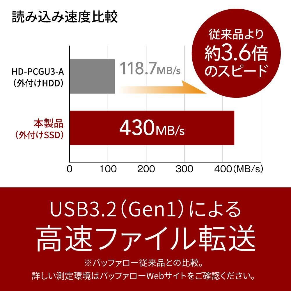 【パソコンのデータ保存に】 最大約430MB/sの高速なファイル転送。バッファロー従来品 外付けHDDよりも約3.6倍速のスピード。当社従来品HD-PCGU3-Aと比較。測定環境はメーカーより欄に記載