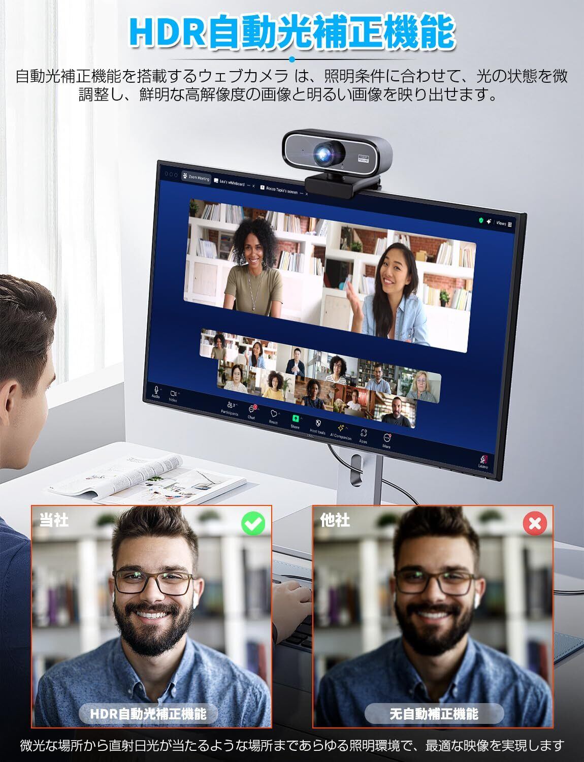 【自動光線調整30FPS広角Webカメラ】自動光線調整機能により、周囲の環境に合わせて明るさを自動で調整するため、会議スペースなどあらゆる照明条件下でも適切な明るさに調整できます。30FPSの広角高画質Webカメラにより、スムーズなウェブ会議や鮮明な動画通話を実現します。