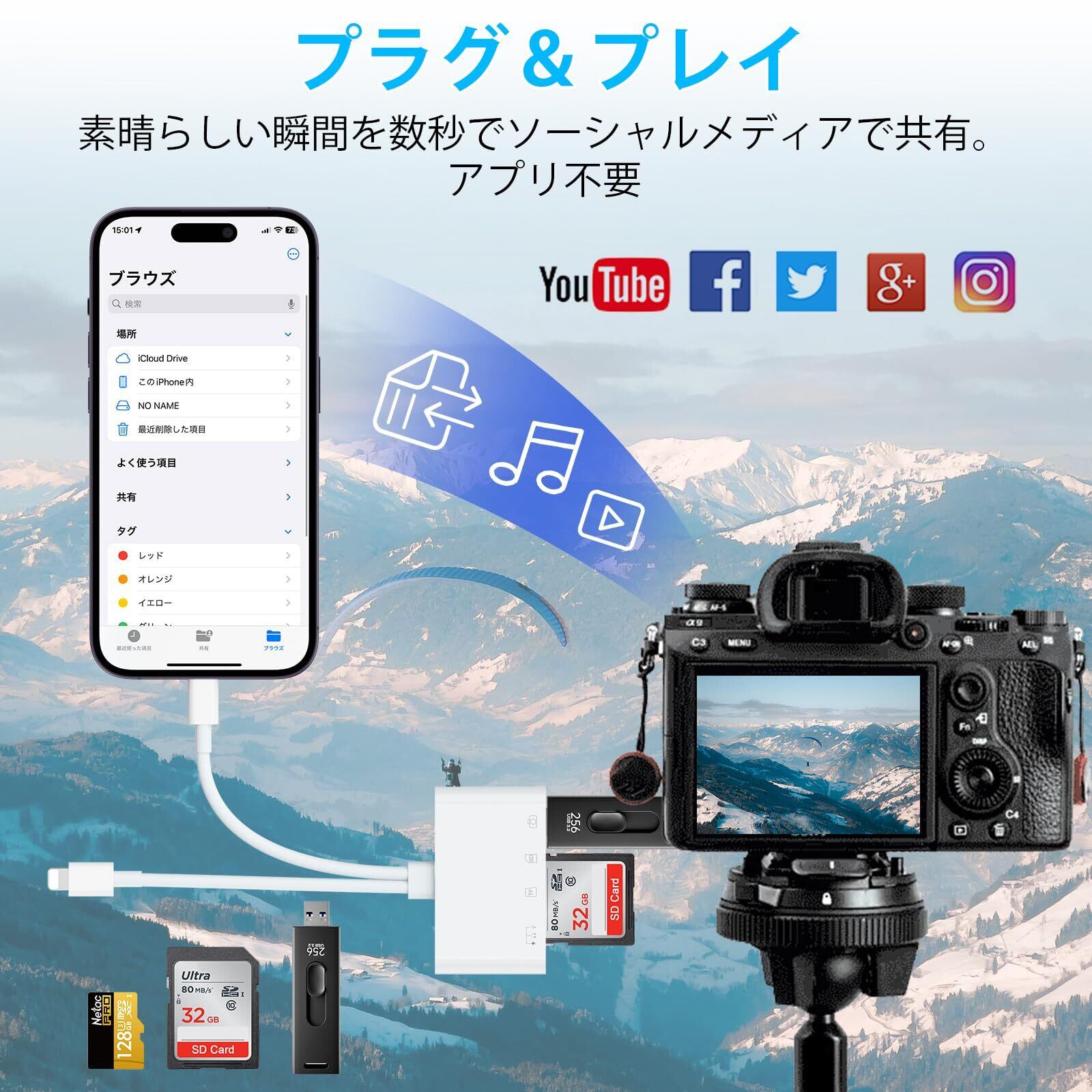 【4in1 iPhone SD カードリーダー】ライトニング sdカードリーダーは最新の2024 MFI認証チップを搭載し、4種類のポート(①SDカードポート、②microSDカードポート、③フル機能Type-Cポート、④USB3.0ポート)を備えている。一般的な用途:カメラの写真転送、機種変更時のデータ転送、ファイルの保存、他の周辺機器とのUSB使用、音楽鑑賞など。