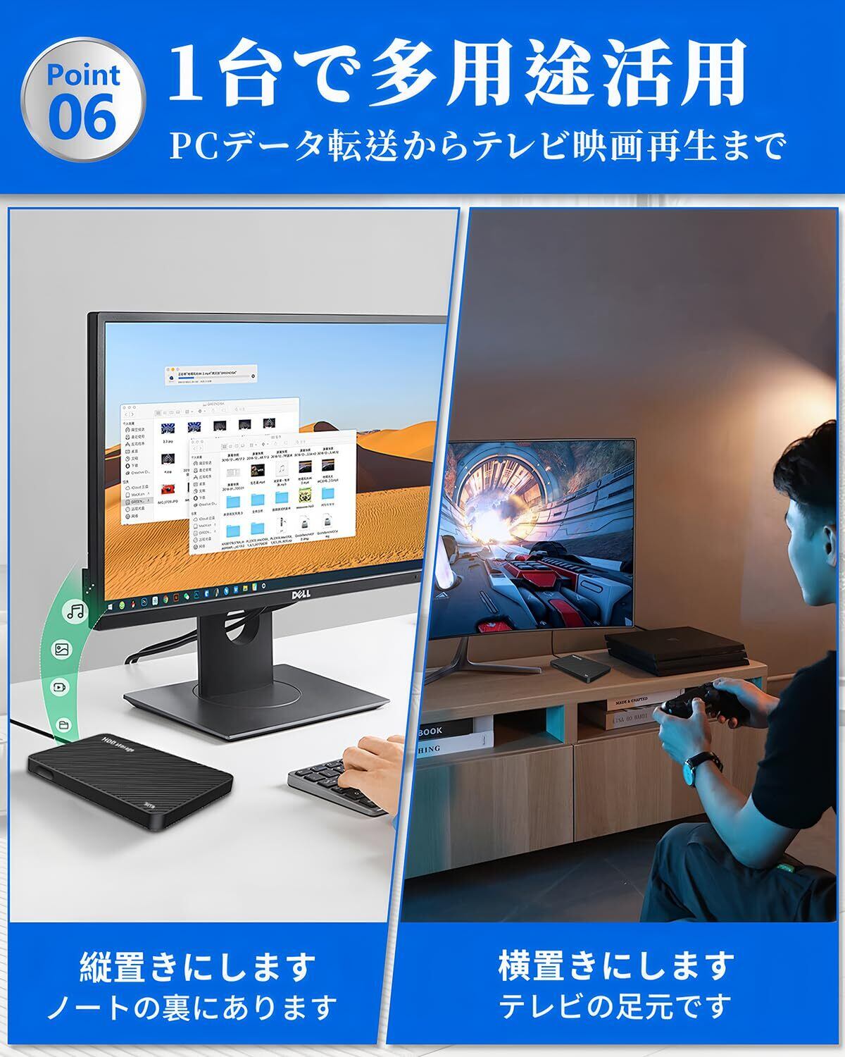 【高速でスムーズな作業】USB 3.0インターフェースに対応し、大量データの転送が効率的。動画編集や4K映像の保存作業でもストレスなく進められるため、作業時間を短縮可能です。さらに、ファイルの読み書き時の安定性にも優れており、大切なデータの取り扱いに信頼が置けます。また、USB2.0との互換性もあり、さまざまなデバイスで使用可能です。