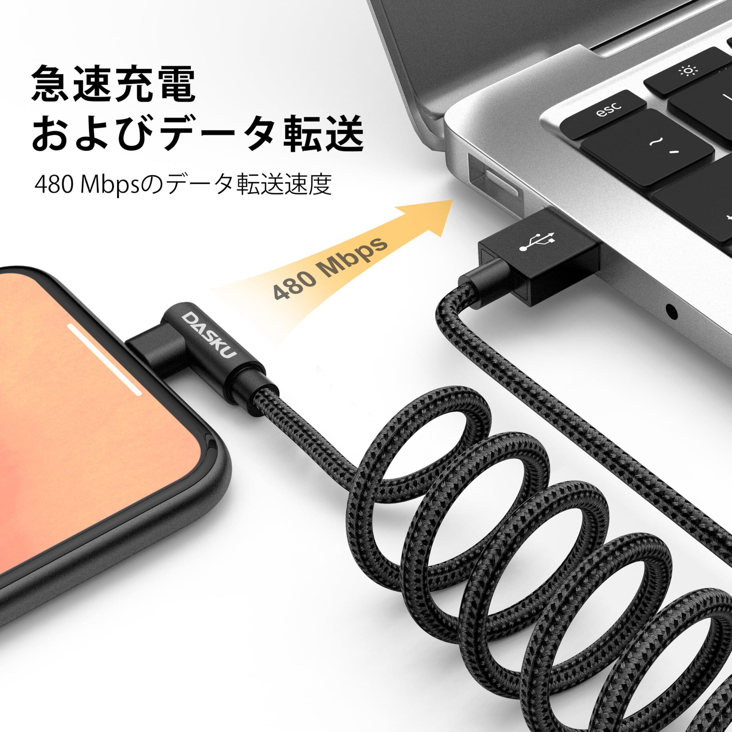 ライトニングケーブル L字: 従来のケーブルと異なり、90度に曲がって「l字型」となっているので、充電の時には、ゲームの操作や動画を見るのは邪魔されない、コンセントやパソコンに繋いでも、ケーブルを無理やりに曲げる必要がなしで、スマホを横向きにして充電したり、ゲームしたり、スタンドやカバンに置いても便利になります。