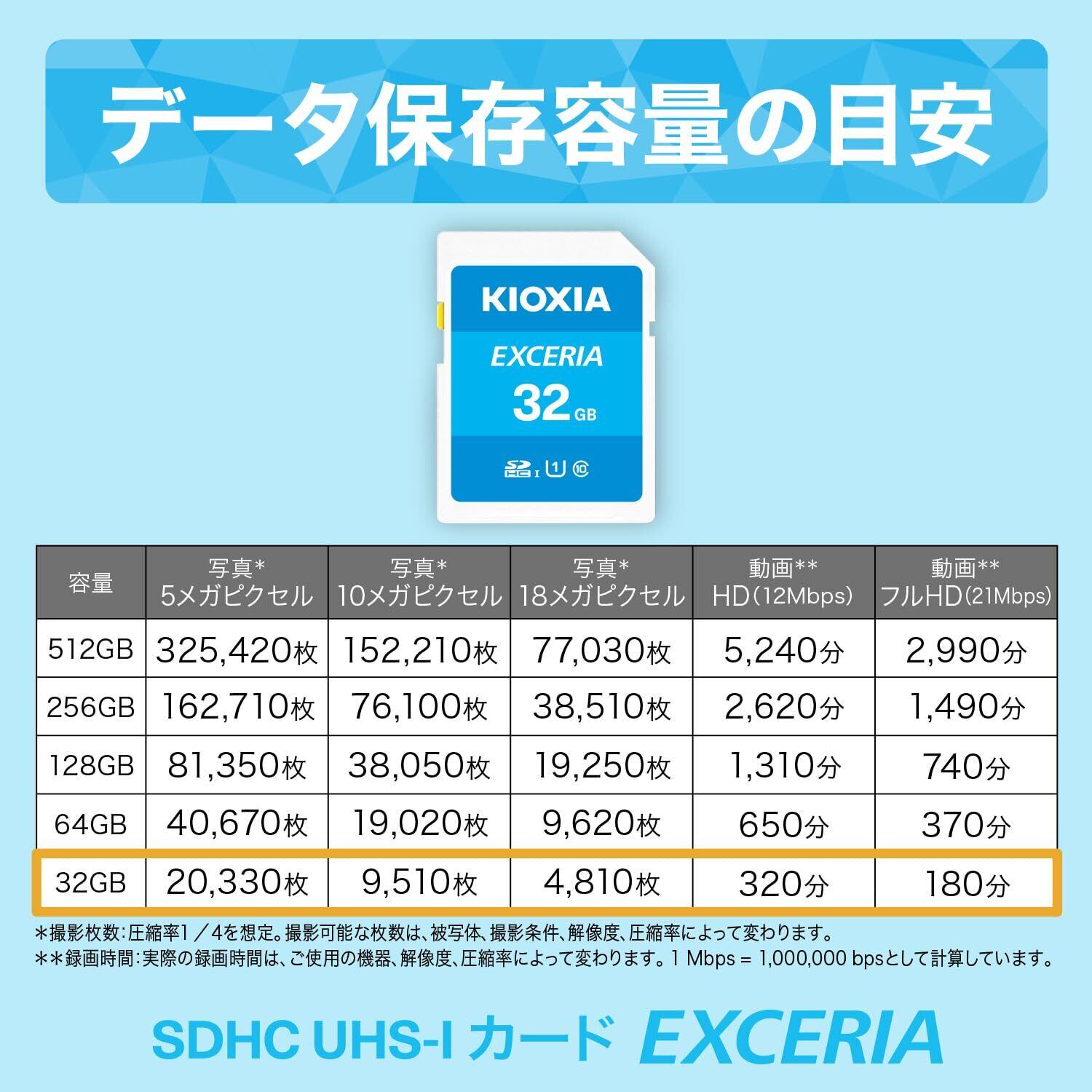 キオクシア(旧東芝メモリ) EXCERIA SDメモリカード UHS スピードクラス 1 (U1)に準拠しフルHDの撮影に適しています。 この商品はAmazon.co.jp限定です。