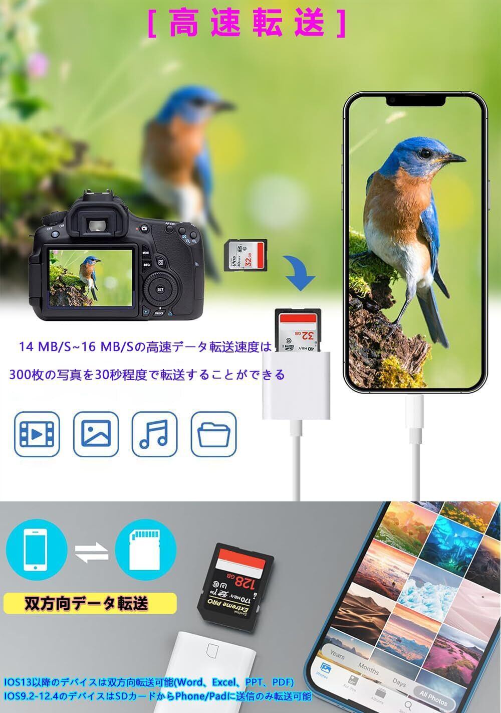 【双方向データ転送】14 MB/S~16 MB/Sの高速データ転送速度は、300枚の写真を30秒程度で転送することができる。大量のデータを一度に移したり、大量のデータが保存されたSDカードを読み込む場合、長時間かかる 可能性がありますので、ご注意ください。データを移す場合にはできるだけ何回かに分けて行ってください。️IOS13以降のデバイスは双方向転送可能(Word、Excel、PPT、PDF)、IOS9.2-12.4のデバイスはSDカードからPhone/Padに送信のみ転送可能.
