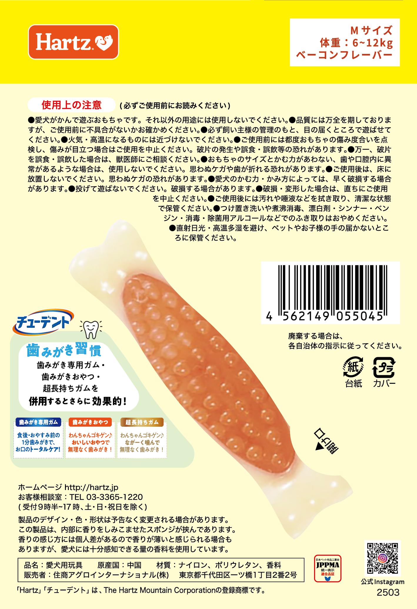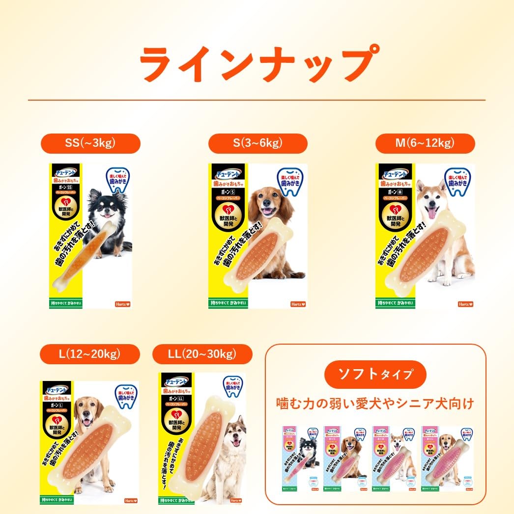 <ハーツのおもちゃ製品ご使用の際のお願い> 思わぬ事故につながらないよう、愛犬の噛む力、好きな遊び方をふまえて、適切なおもちゃを選んであげましょう。 おもちゃを使うときは、必ず大人の飼い主様が注意深く見守っていてください。 ■噛む力が強くても、歯が弱い愛犬がおもちゃを強く噛むと、歯が割れたり折れたりすることがあります。 ・犬種、年齢によって愛犬の状態は様々ですので、飼い主様が注意深く見守りながらお使いください。 ■強く噛むと製品の一部が欠けて口に入ることがあります。 ・ハーツのおもちゃには重金属などの有害物質を含んでおりません。 ・また小さなものであればほとんどの場合、便と一緒に排出され、問題はありません。 ・大きな破片を飲み込んでしまった場合や、異常を感じる場合にはかかりつけの獣医師にご相談ください。