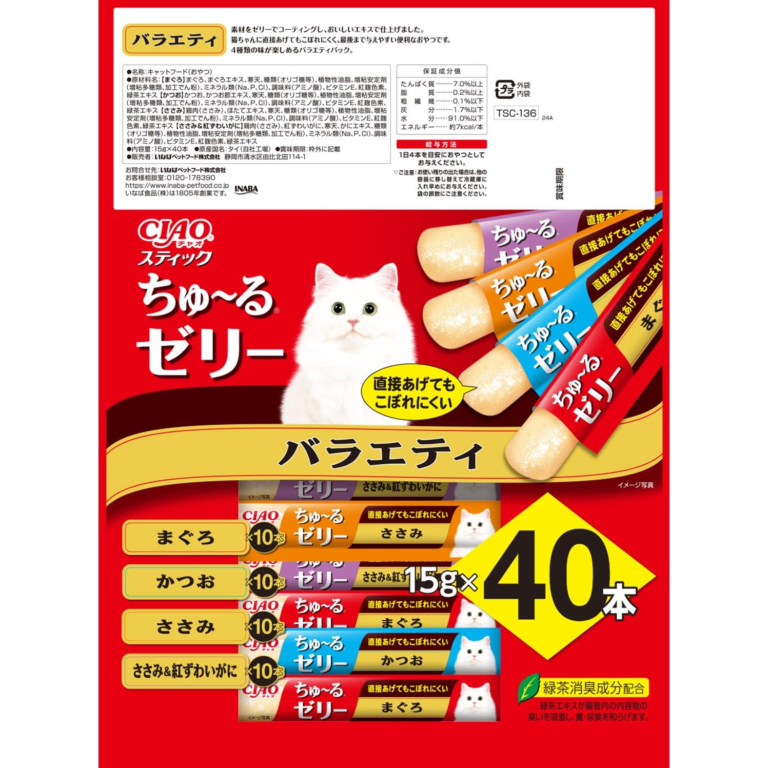 【まぐろ】まぐろ、まぐろエキス、寒天、糖類(オリゴ糖等)、植物性油脂、増粘安定剤(増粘多糖類、加工でん粉)、ミネラル類(Na、P、Cl)、調味料(アミノ酸)、ビタミンE、紅麹色素、緑茶エキス【かつお】かつお、かつお節エキス、寒天、糖類(オリゴ糖等)、植物性油脂、増粘安定剤(増粘多糖類、加工でん粉)、ミネラル類(Na、P、Cl)、調味料(アミノ酸)、ビタミンE、紅麹色素、緑茶エキス【ささみ】鶏肉(ささみ)、ほたてエキス、寒天、糖類(オリゴ糖等)、植物性油脂、増粘安定剤(増粘多糖類、加工でん粉)、ミネラル類(Na、P、Cl)、調味料(アミノ酸)、ビタミンE、紅麹色素、緑茶エキス【ささみ&紅ずわいがに】鶏肉(ささみ)、紅ずわいがに、寒天、かにエキス、糖類(オリゴ糖等)、植物性油脂、増粘安定剤(増粘多糖類、加工でん粉)、ミネラル類(Na、P、Cl)、調味料(アミノ酸)、ビタミンE、紅麹色素、緑茶エキス