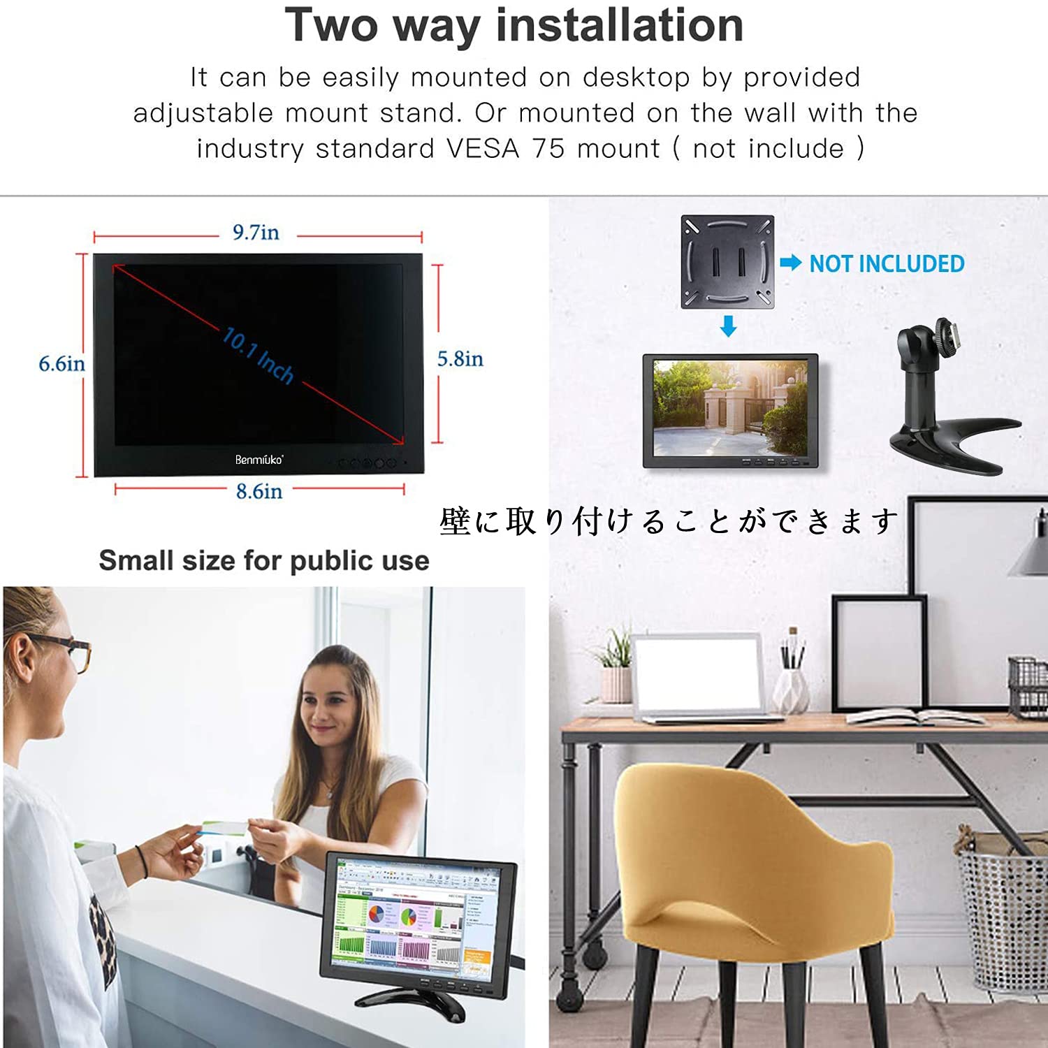 包装付属品--- 1 * LCDモニター、1 * HDMIケーブル、1 * VGAケーブル、1 * BNCケーブル、1 *電源(長さ2メートル)、1 *マウントスタンドが付属しています。日本語取扱説明書付き。