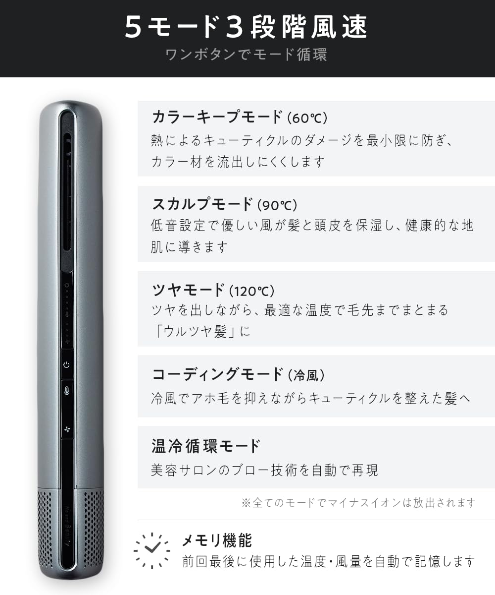 ?【スティック形状で実現】珍しいスティック形状。吹き出し口の面積を広く取れるので速乾を実現。髪を乾かす理想的な距離を無理なく自然に取れるため腕の疲れも軽減します