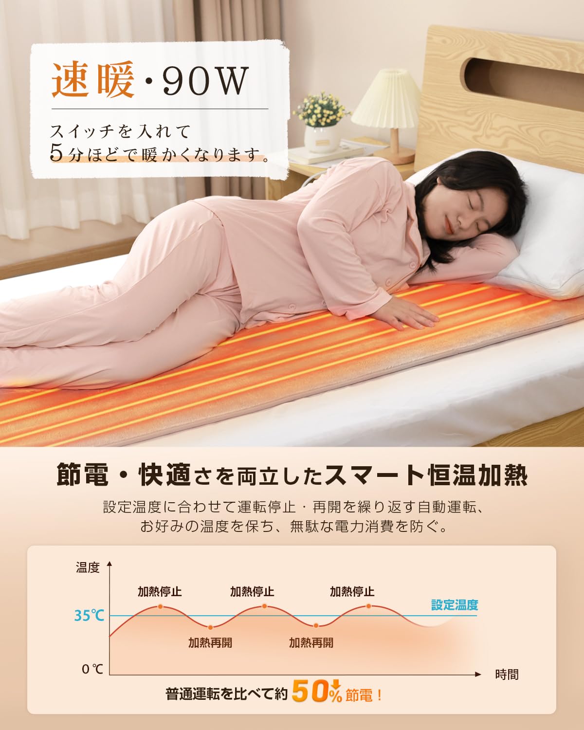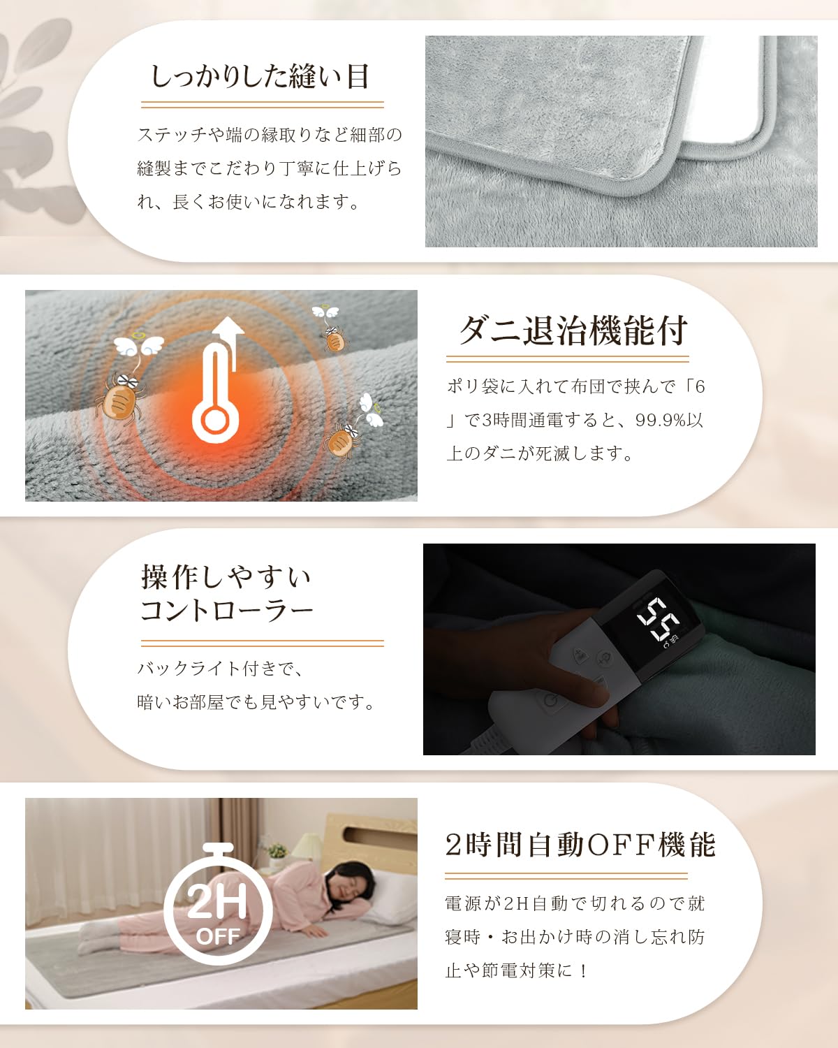 特徴 無段階温度調節、1-12時間タイマー、自動恒温運転で賢く節電、洗える、 ダニ退治