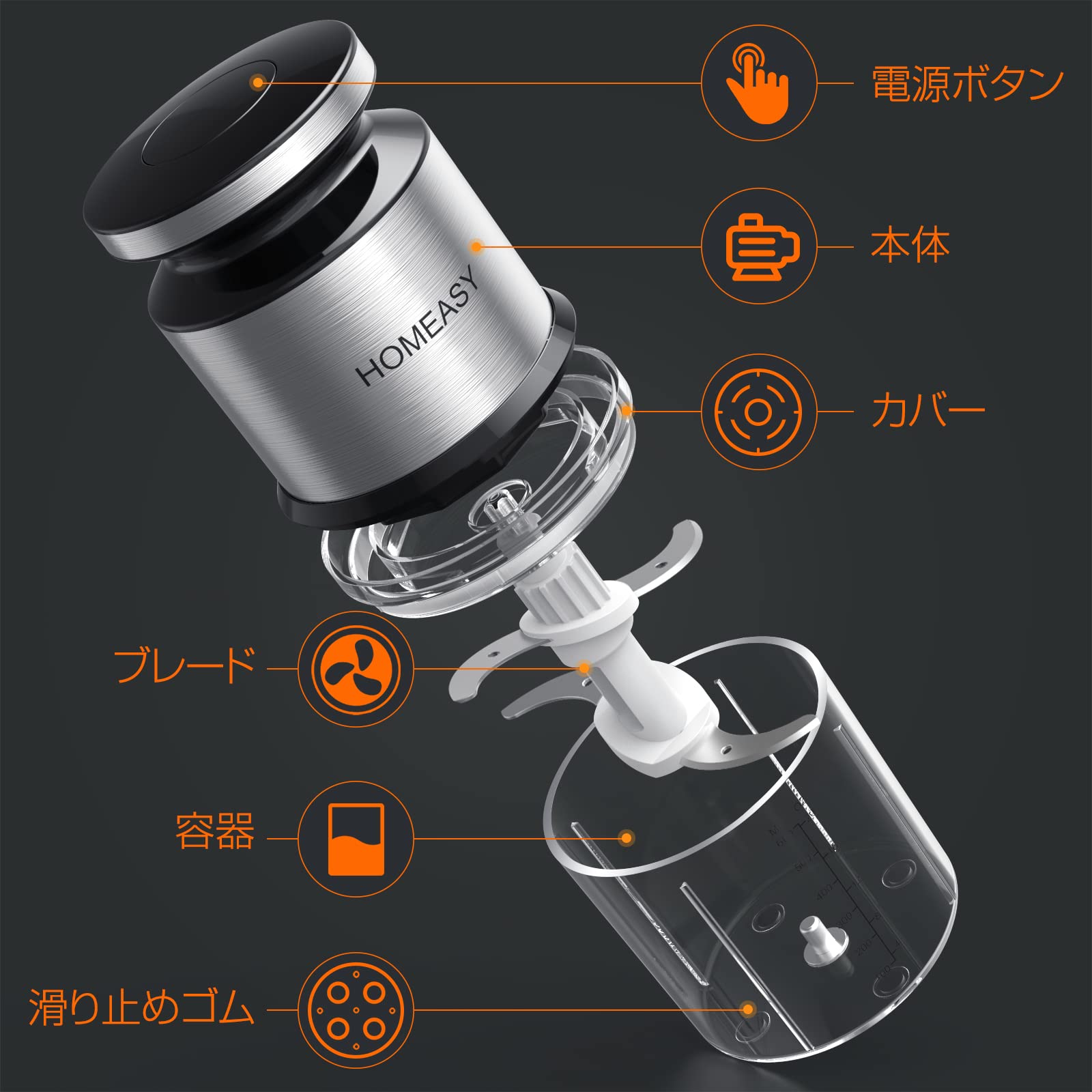 【在庫処分】HOMEASY フードプロセッサー 1台4役(刻む/混ぜる/潰す/砕く) 600ML フードチョッパー ステンレス4枚刃 300Wハイパワー 省スペース 調理家電 コンパクト 軽量 簡単操作 水洗い可能 シルバー | POPストア