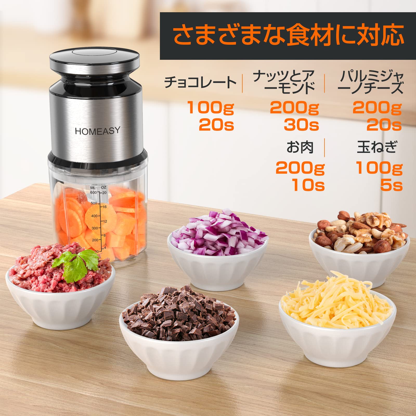 HOMEASY フードプロセッサー 1台4役(刻む/混ぜる/潰す/砕く) 600ML フードチョッパー ステンレス4枚刃 300Wハイパワー 省スペース 調理家電 コンパクト 軽量 簡単操作 水洗い可能 シルバー