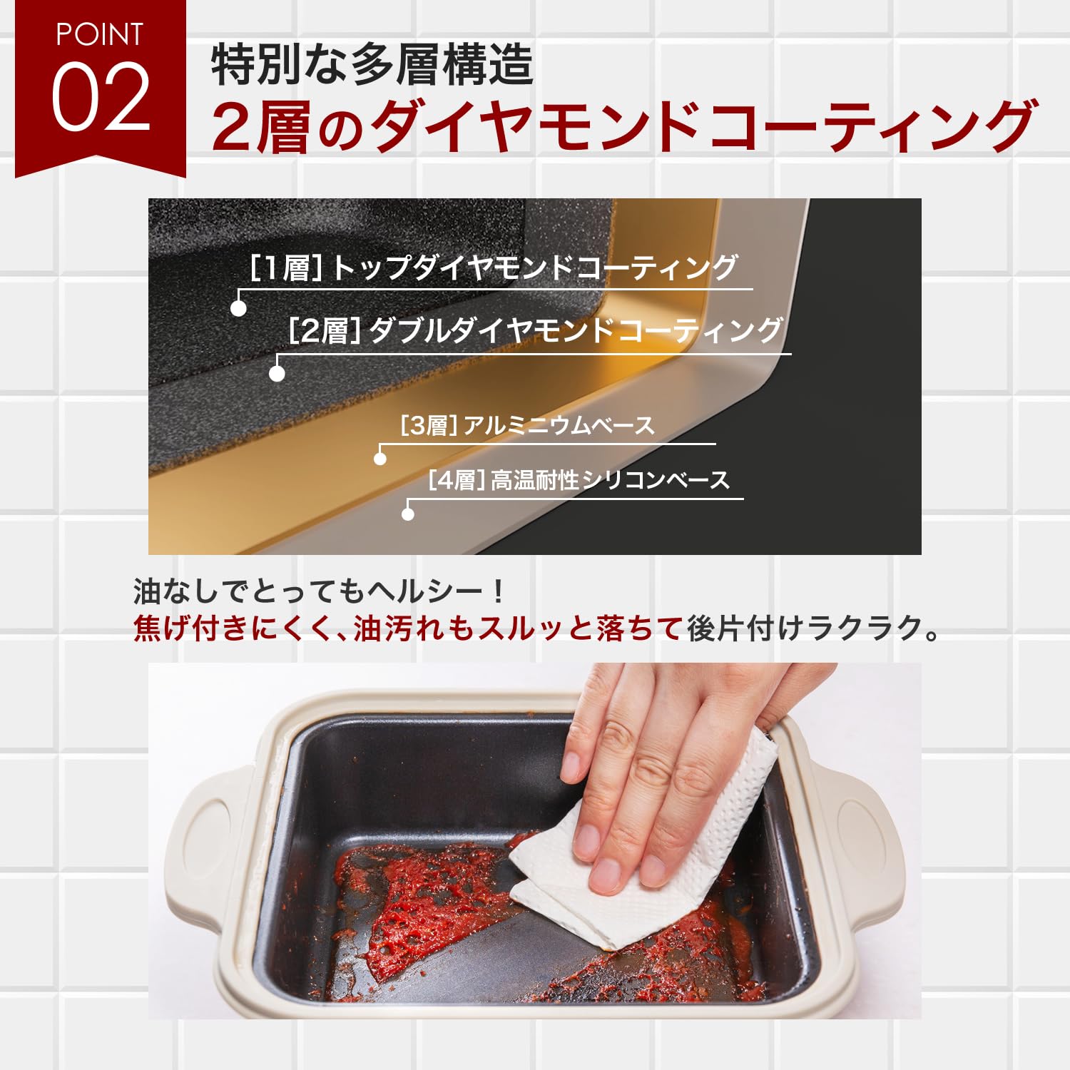 2層のダイヤモンドコーティング加工で焦げ付きにくく油汚れも落ちやすいから、お手入れもラクに長く愛用できます