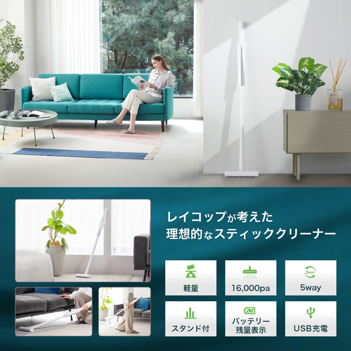 【特価セール】レイコップ コードレス掃除機 0.8kg超軽量16000Pa強力吸引 USB Type-C充電式 5Wayスティッククリーナー そうじき 車用掃除機 収納スタンド付き HEPAフィルター 静音設計 RAC-100JPW | POPストア
