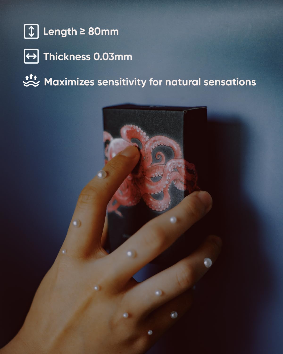 超薄型デザインで快適フィット? 厚さわずか0.03mmの超薄型設計により、まるで何もつけていないような自然な使用感を実現します。指にしっかりフィットし、使用中にズレる心配がなく、親密な瞬間に集中できます。