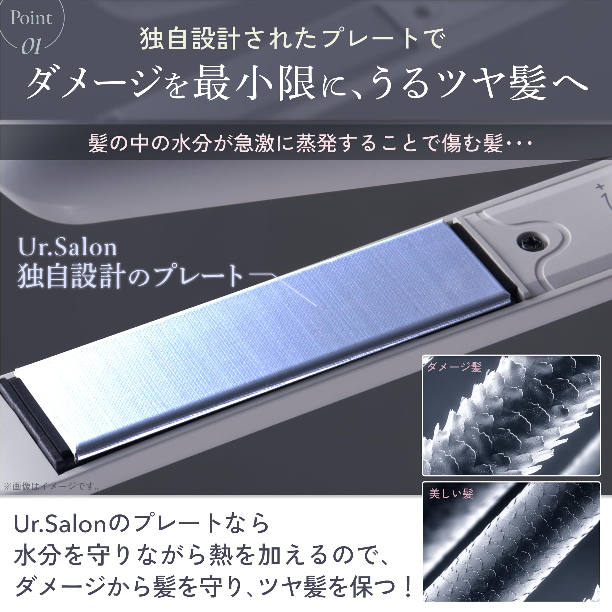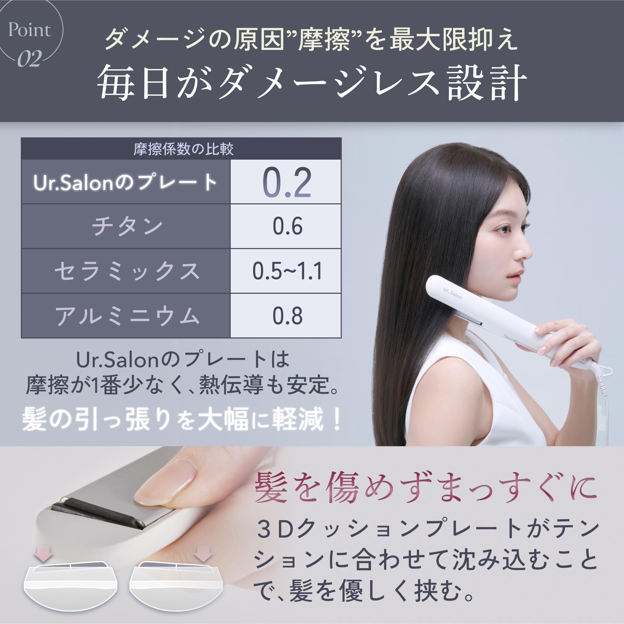 ?もう一度、髪に恋をする。Ur.Salon プレミアムビューティ ヘアアイロン? ? 【わたし史上、最高の“うるツヤ髪”へ】 朝、鏡の前でふと笑顔になる瞬間を。独自設計のプレートが髪内部の潤いをぎゅっとキープ。アイロンをあてたときの“ジュッ”という不安な音も抑えて、なめらかに通るたびにダメージレスな仕上がりに。触れたくなるツヤ、指通り、あなたの髪が主役になる毎日を。