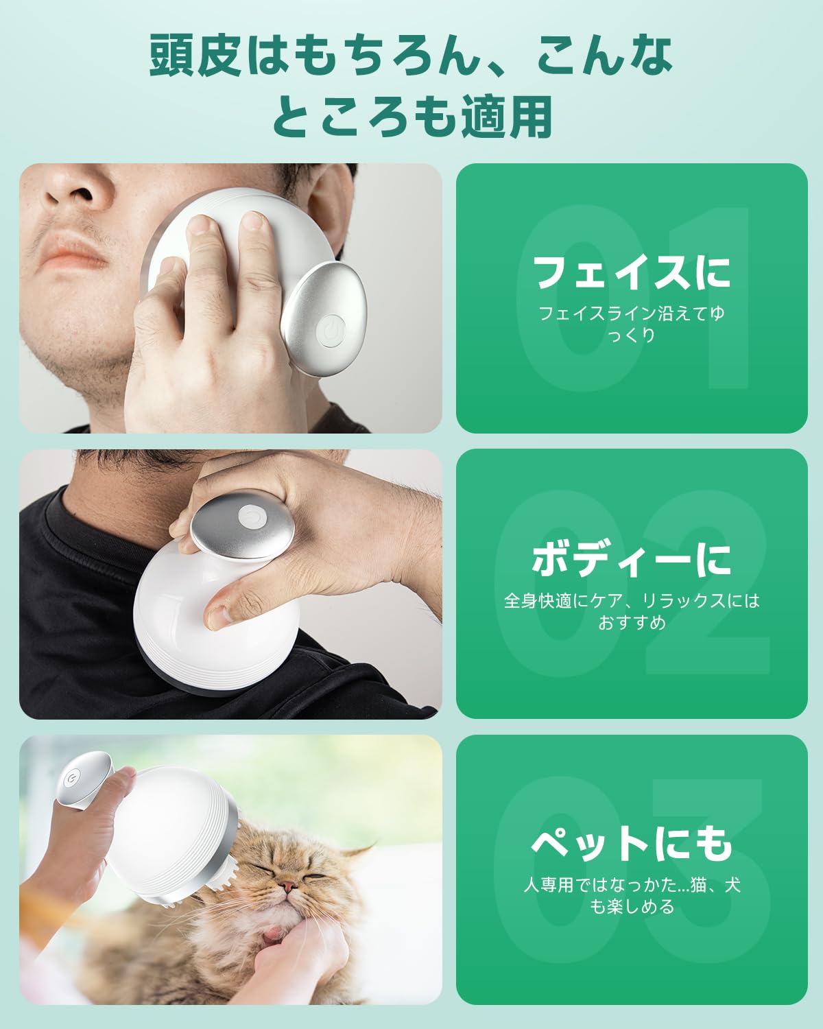 【すごうでヘッドケア】プロの技術を参考し、手のひらで握りやすいようにデザインされています。回転可能なヘッドが4つあり、付属品それぞれに19個の独立したテーパ、総計76個の錐形触角があります。プロの技術を模倣し、ただのブラシを超えるサロンレベルの技術を再現できます。