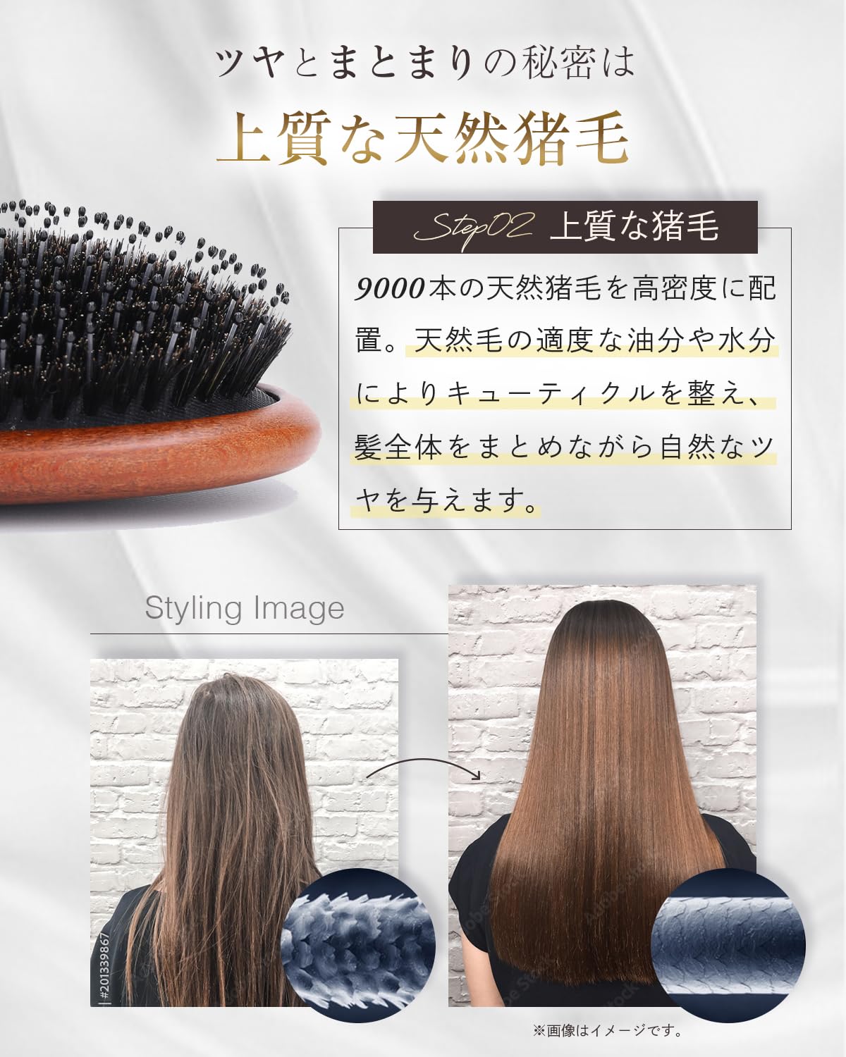 ?天然猪毛×丸玉ナイロン毛のダブル植毛。長めのナイロン玉がもつれやからみを取り除き、不ぞろいで短い猪毛が毛流れを整え、同時に頭皮付近の皮脂を万遍なく毛先まで行き渡らせ、髪に美しい艶を出してくれます。