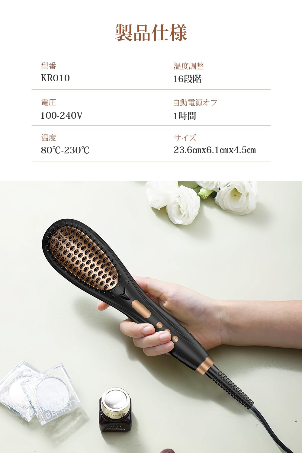 【10℃ごと調整で16段階温度MAX 230℃】 10℃ごと調整できるストレートブラシ ヘアアイロンの温度設定範囲は80℃〜230℃まで、合計16段階です。熱効率も高く、各種髪質に適してます。難しいテクニックが不要でも自分に合う温度は必ず見つけ出せます。適度な間隔で配置された発熱ピンは、耐高温ナイロンが加熱部分を包まれ肌に触れにくくのに、いろんな角度から髪に熱が加えられ、髪をしっかり捉えながらも髪抜けがよく、男女問わず質感よく仕上がります。