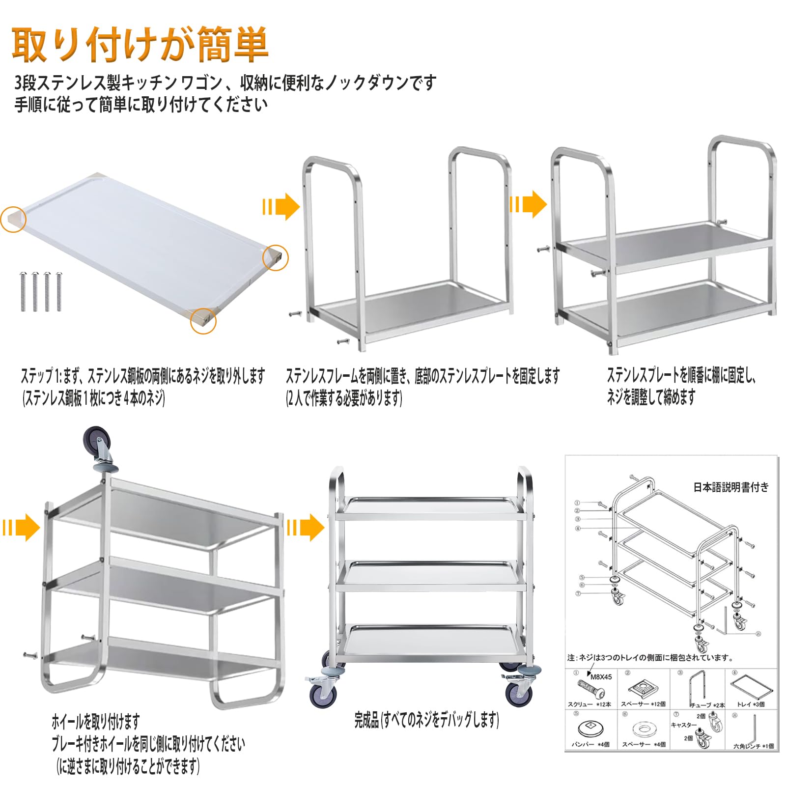 【簡単な組み立て】ワゴン キャスター付き 3段 複雑な手順を必要とせず、同梱の説明書に従って組み立てられます。ネジが紛失しないように、ネジはステンレス板に固定されています。取り付け時には、両側のネジ(各層4本)を外してください。このキャスター付きのワゴンは、食堂、レストラン、キッチン、ホテル、店舗、病院、介護施設などに適しています。