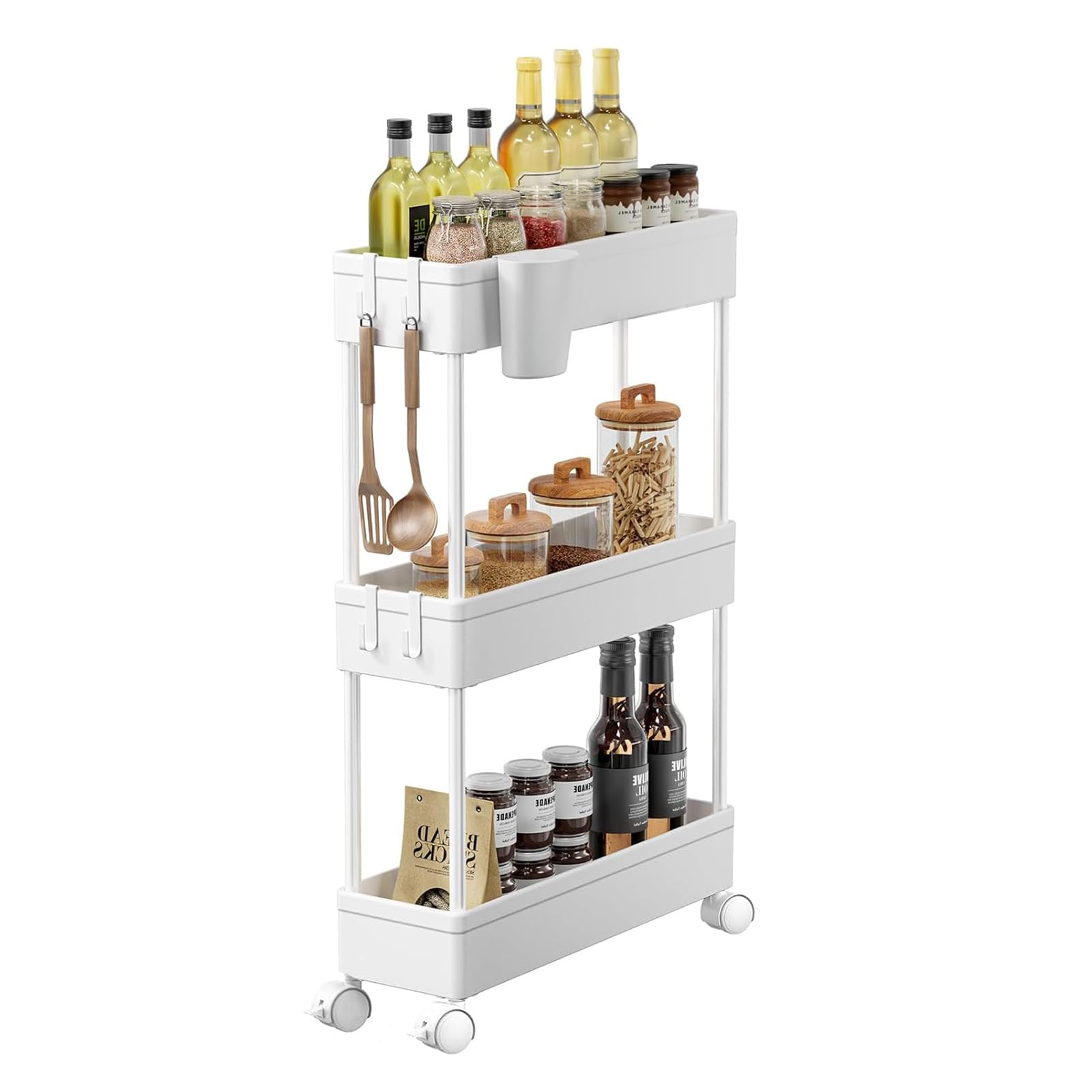 【新春セール】SIUSA キッチンワゴン キャスター付き ワゴン 隙間収納 スリム 収納カート キッチン 洗面所 収納 13.5cm 18cm 22cm 冷蔵庫横 台所 浴室 トイレ 細い棚 3段 4段 おしゃれ 組立簡単 フック&収納カップ付き (3段式-[13.5cm]-ホワイト) | POPストア