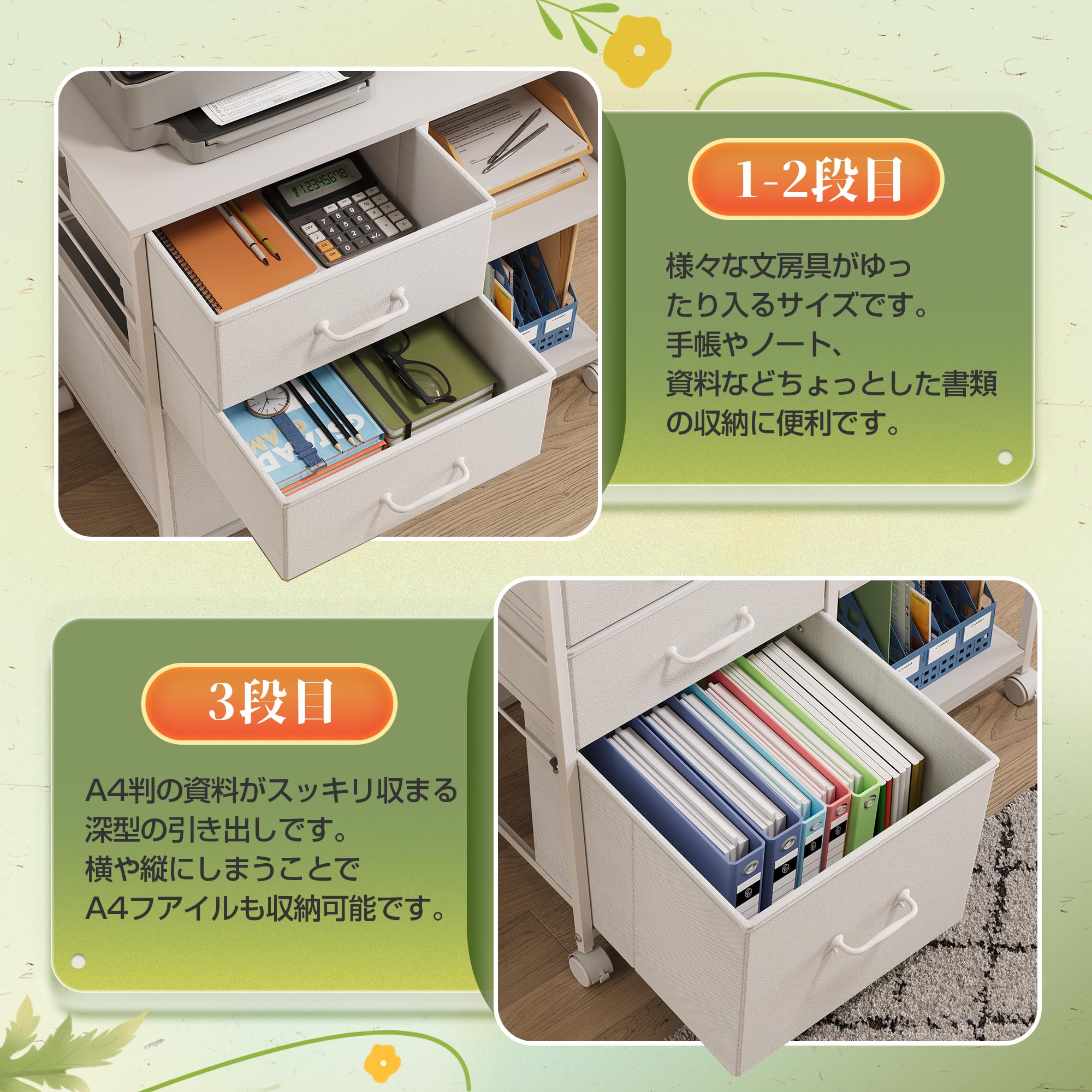 キャスター付きで移動便利:キャビネットには移動性のある車輪が付属しており、ニーズに応じて簡単に移動することができます。キャスターの高さは、掃除ロボットの通過にも配慮しており、清掃がより容易になります。また、引き出しが布製であるため、製品全体が非常に軽量で移動が容易です。布の柔軟性と軽さは、室内の移動や配置の変更を簡単に行えるようにしています。