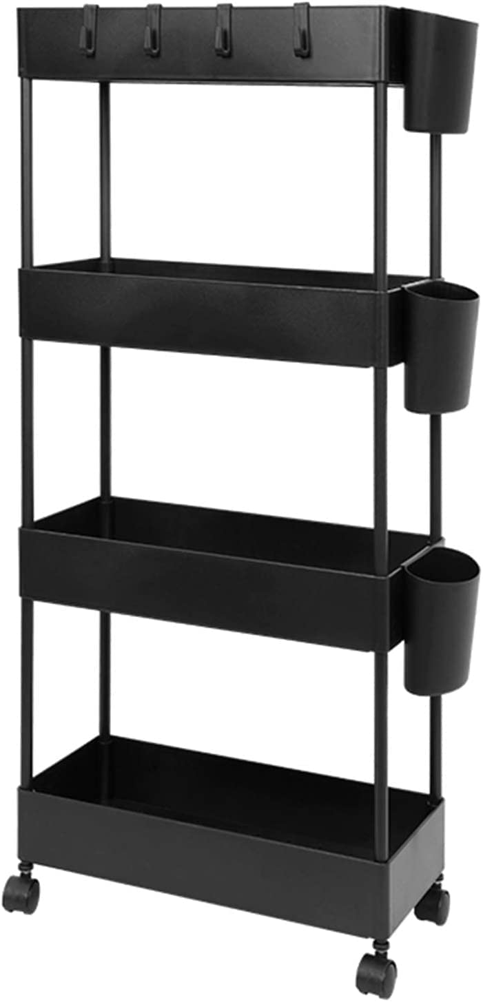 隙間収納 キッチン 4段 18cm 幅 キャスター付き キッチンワゴン スリム 収納 洗面所 すき間収納 ランドリー ラック 薄型 木製 すき間 キッチン収納 ワゴン 冷蔵庫横 ストック浴室 収納(フック四つ バスケット三つ付き) (黒)