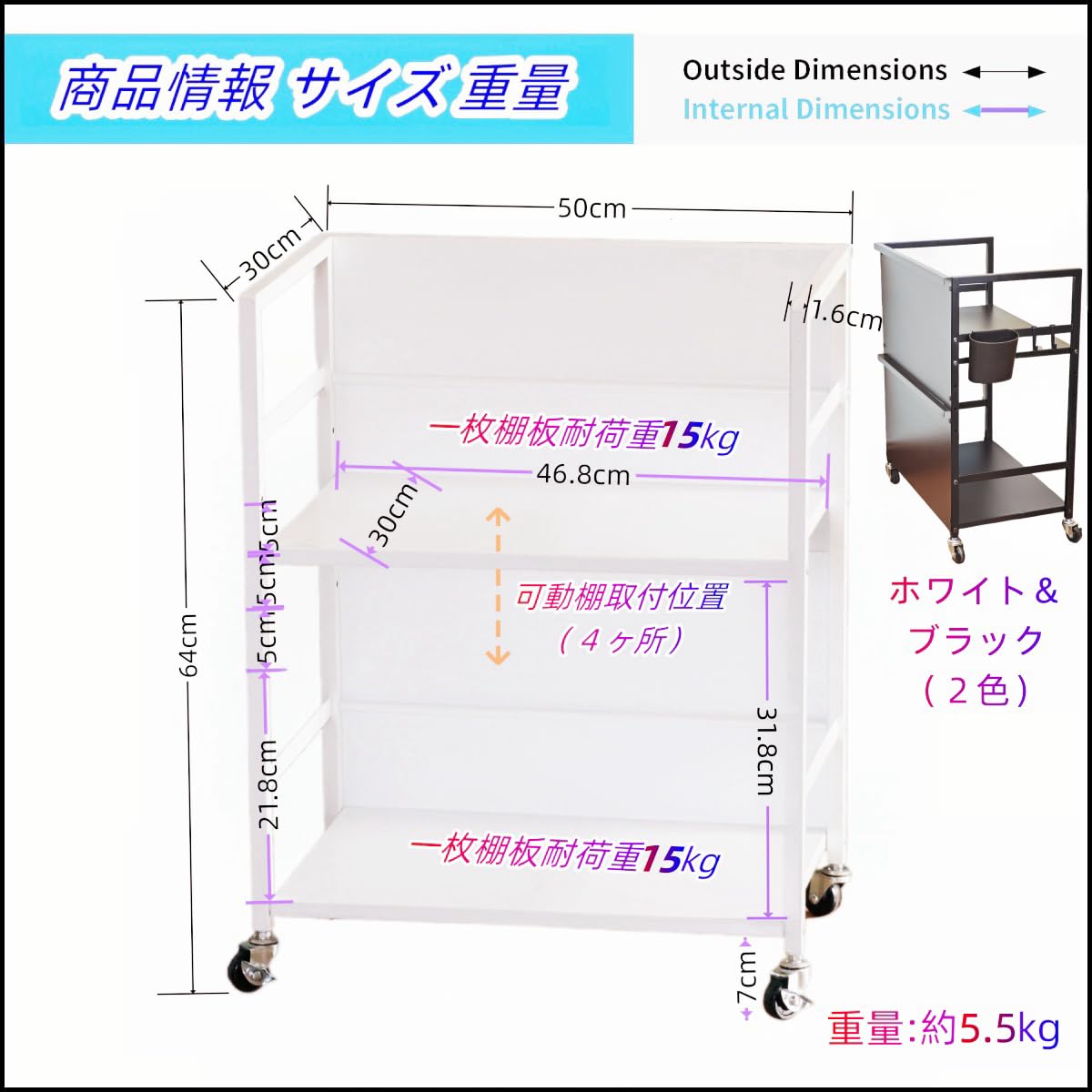 サイズ:幅50×奥行30×高さ59/64cm(アジャスター/キャスター)。本体重量:約4.5kg 等分布耐荷重:棚板/各15kg 総耐荷重:30kg (カップ: 約500g フック1つあたり: 約250g)。