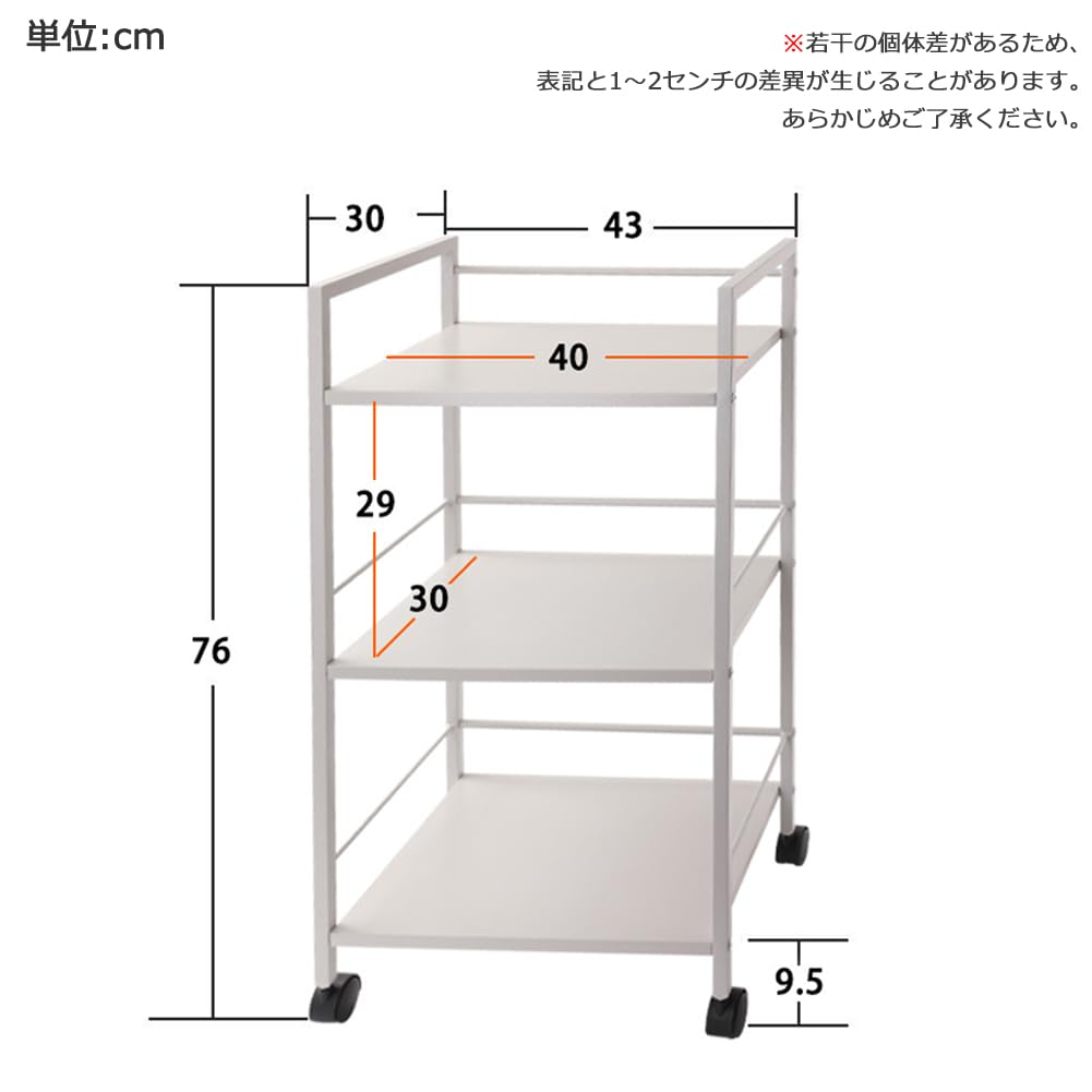 【収納ワゴンの仕様】外寸:3段 43*30*76cm 棚板内寸:40*29cm 段差:29cm 重量:3.4kg 素材:スチール カーラ:ホワイト 計測により若干の誤差が生じます。あらかじめご了承おきください。