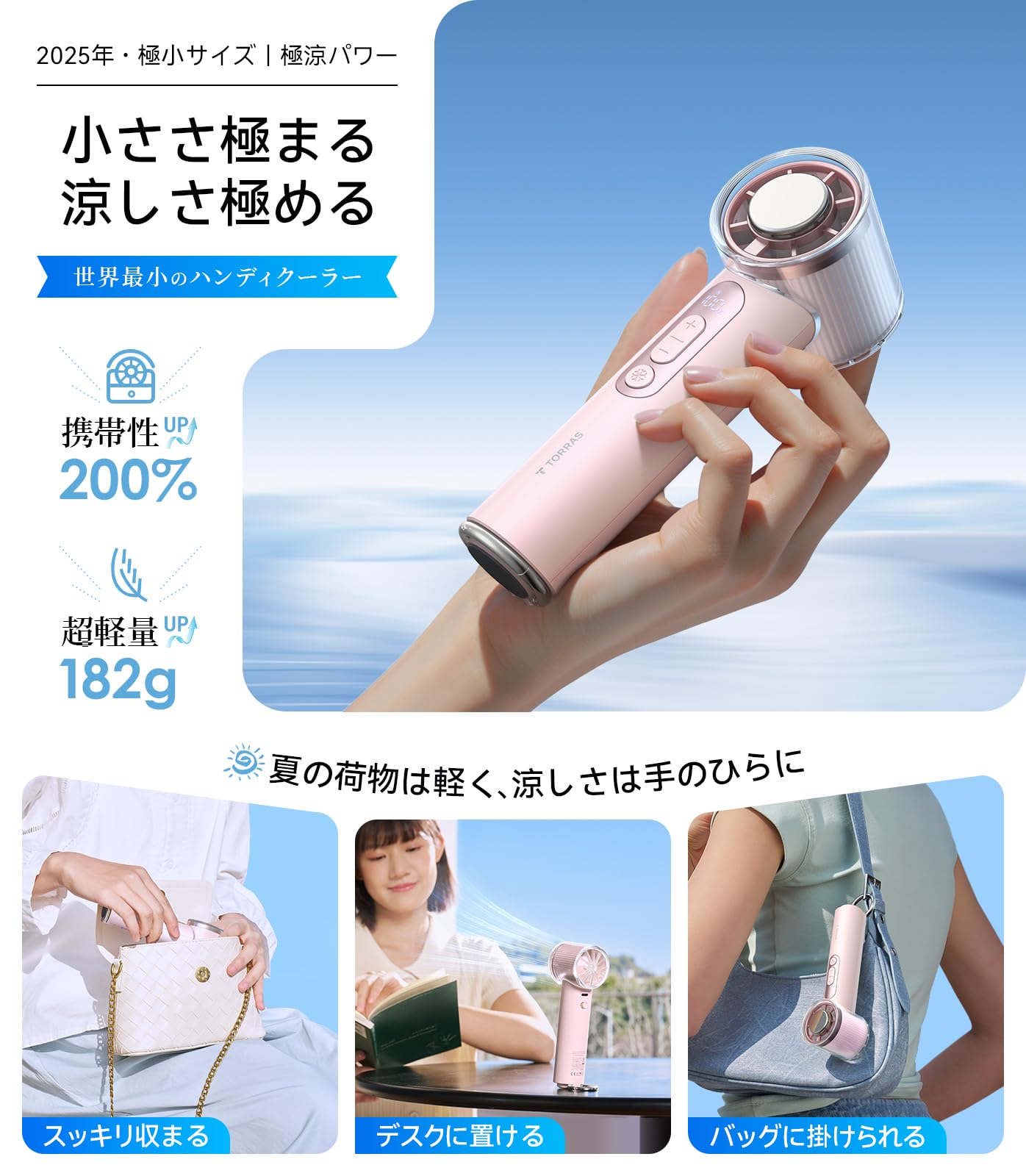 【2025最新作!業界最小サイズのハンディクーラー】2024 CESイノベーション賞受賞の超小型設計ハンディファン(45×50×150mm)。半導体冷却プレート搭載で、従来の手持ち扇風機より40%小型化。手のひらサイズ(182g)でありながら、本格的な冷房効果を実現。鞄ポケットにも収まるコンパクト設計で、通勤やアウトドアに最適。夏のファッションにも映えるおしゃれアイテムとして、熱中症対策を革新します。