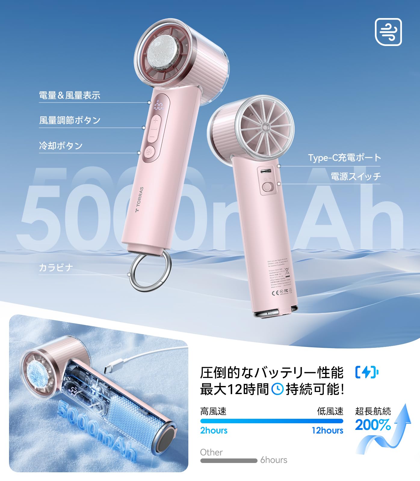 【特価セール】【2025新登場・COOLiFY iva】TORRAS ハンディファン 冷却プレート 手持ち扇風機 携帯扇風機 小型 100段階 静音 最大12時間動作 Type-c 充電式 5000mAh カラビナ付き ミニ扇風機 プレゼント ピンク | POPストア