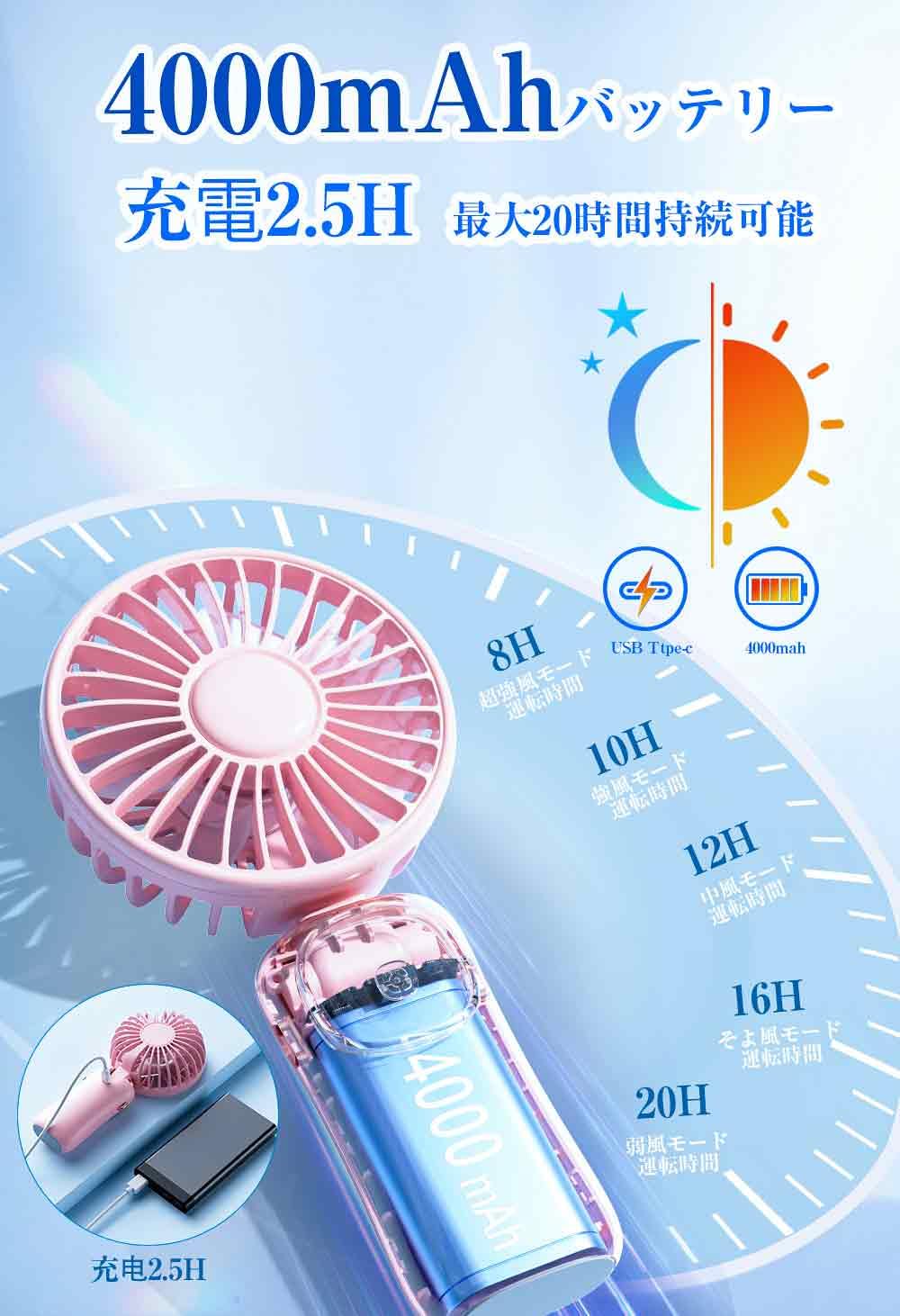 【20時間連続使用】ハンディファンのバッテリーは4000mAhの超大容量です。充電時間は2.5時間だけで、20時間連続使用は可能!外出先でのバッテリー切れを心配せず使えますし、こまめに充電する手間も省けます。