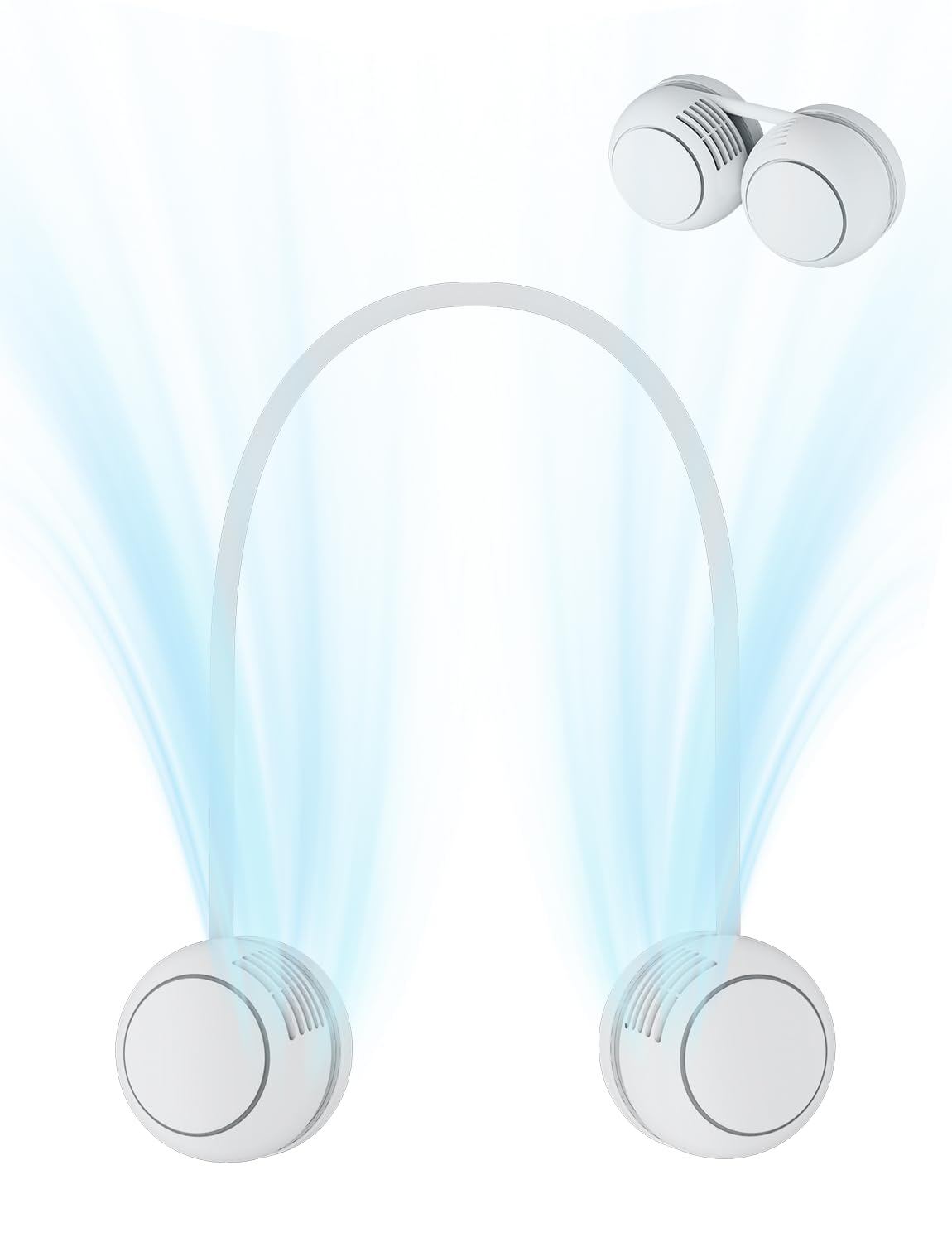 【折り畳み首掛け扇風機】ネックバンドファンはくるっと巻いてコンパクトに収納可能です。羽根なしタイプで、髪や手を巻き込む心配がありません、安全安心に使用できます。 荷物が多い時や雨の日など、両手を解放が自由に使えます。シリコン素材で肌に直接触れるネックバンド部分には、やわらかな感触で首にやさしくフィットすることができます。肌に触れる面積を最小限にし、密着することで生じる汗やムレなどの不快感を最低限に抑えています。アームを巻くことで長さの調節もでき、老人から子供まで自分に合わせたサイズにセットすることも可能です。