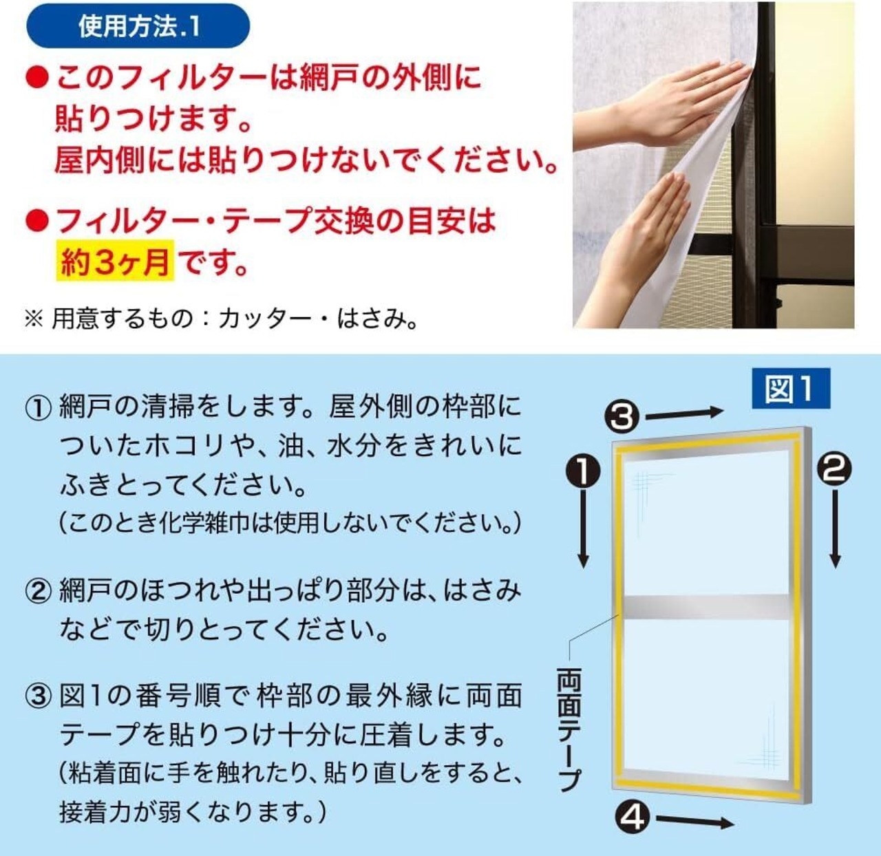 網戸に付属の両面テープで貼るだけで花粉を約80%ブロック