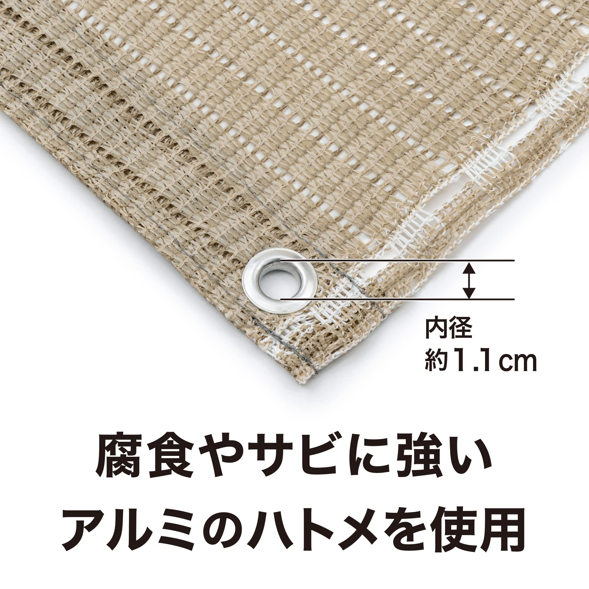 破れにくい。アルミハトメ、生地折り返し加工で強くて破れにくい。豊富な取付方法。物干し竿が通せるボールポケット付き。(直径3cmまで対応)ポールポケットを下側にして市販のボール等を入れるとピンと張れる。目かくしにも使えるボタンホール仕様。
