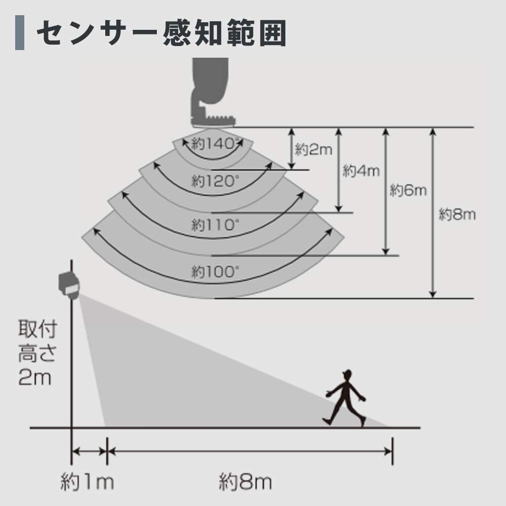 センサー検知距離:約8m・センサー検知角度:約140°(距離2mでの感知角度)